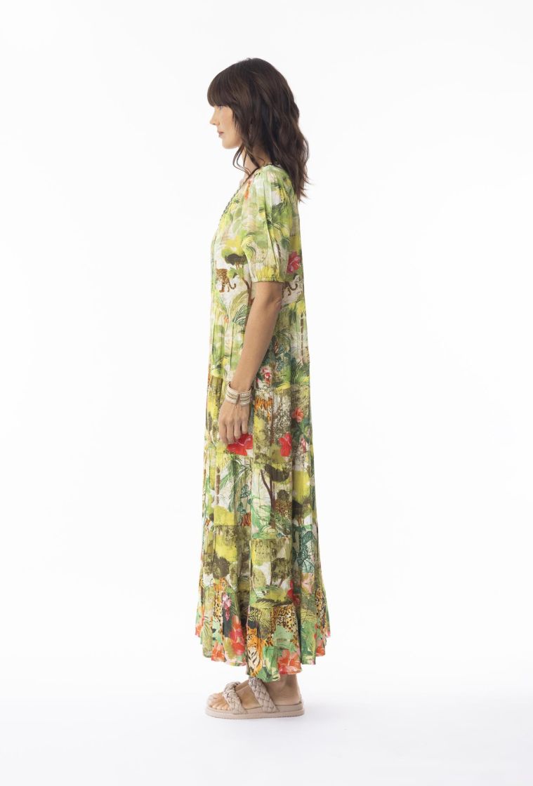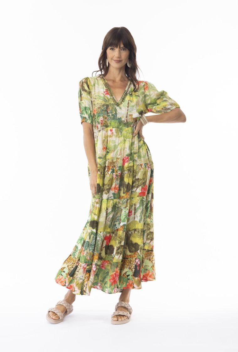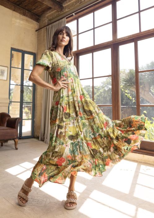 Ihana, mukanasi aaltoileva mekko Escape:lta jossa on naisellinen syvä V-pääntie kiiltävillä koristeilla.