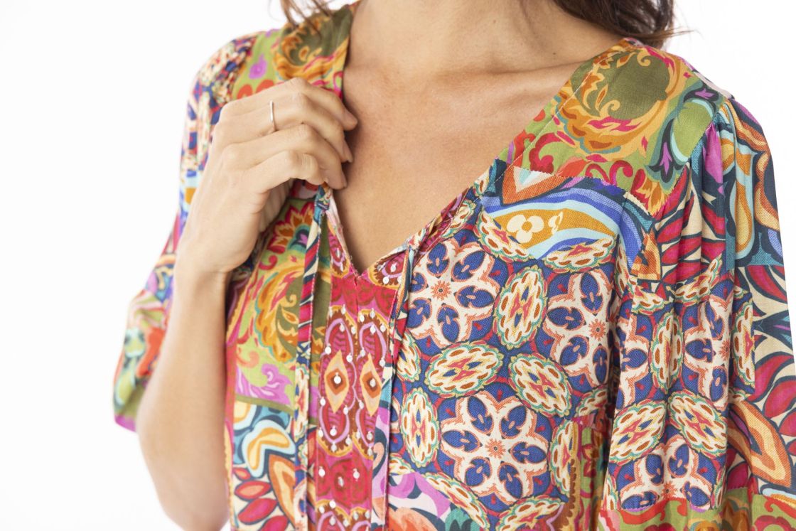 Pyöreä pääntie jossa koristeena nauhat tupsuilla, naisellinen halkio ja kiiltävät yksityiskohdat.