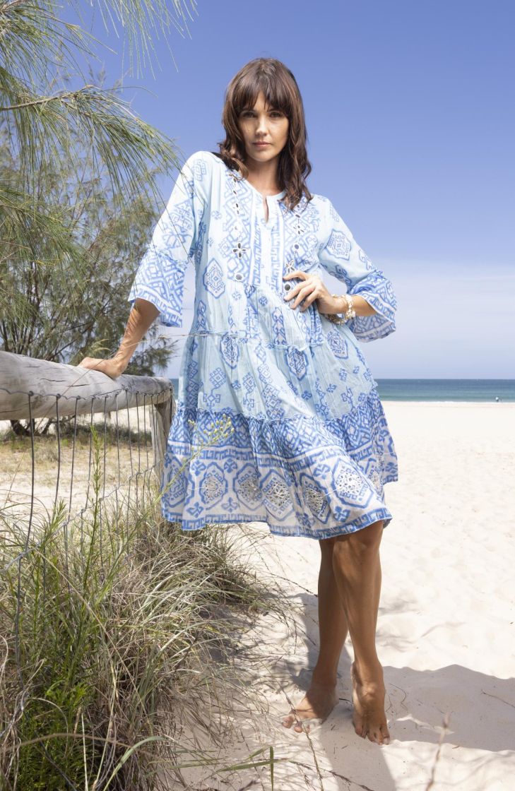 Lyhyempi Carla-mekko jossa on lyhyempi istuvuus ja ohut puuvilla kangas joka aaltoilee mukanasi. Täydellinen kesään ja meren äärelle!