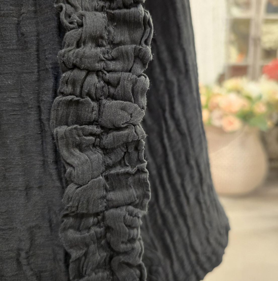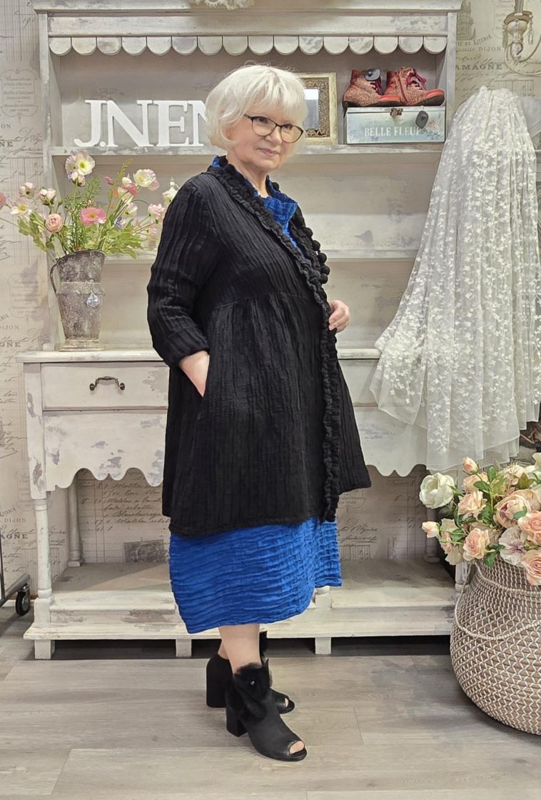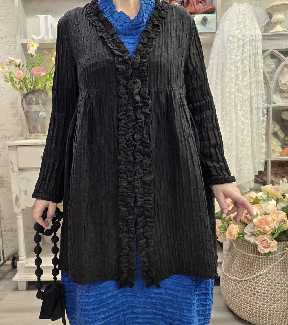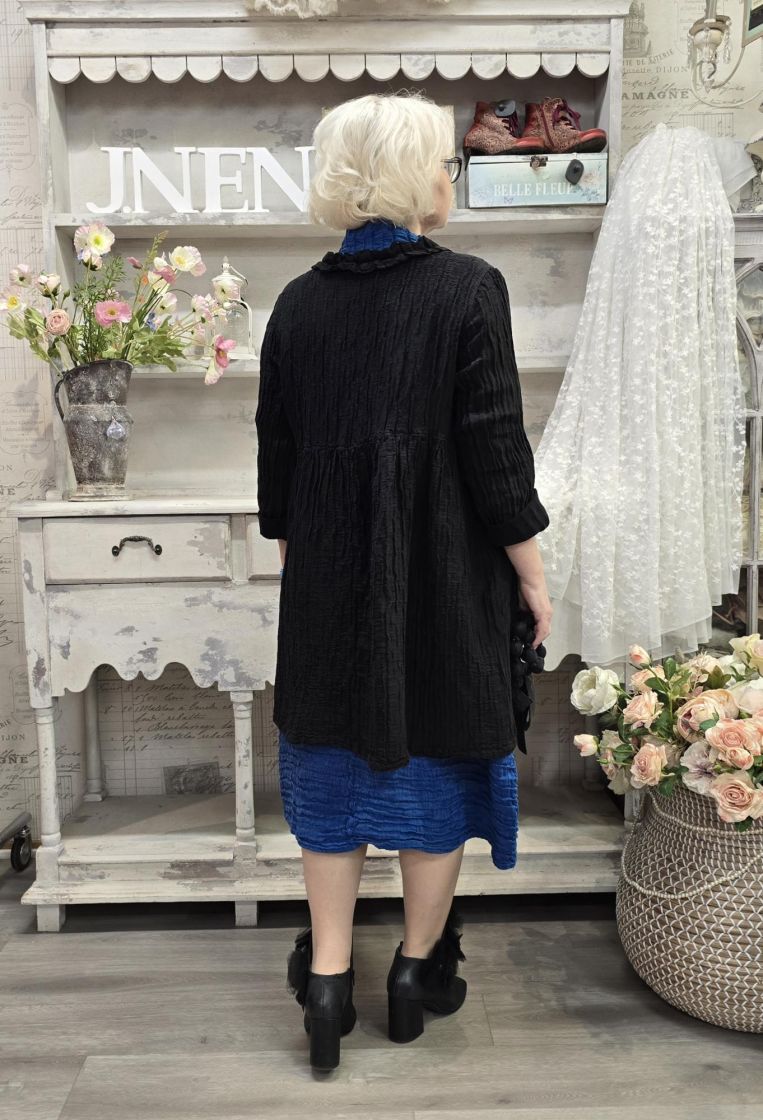 Tämä uniikin mallinen Grizas jakku on valmistettu klassikko silkki/pellava laadusta ja siihen on ommeltu kaunis tekstuuri.