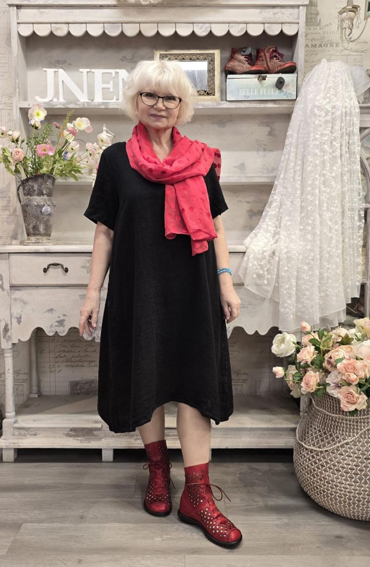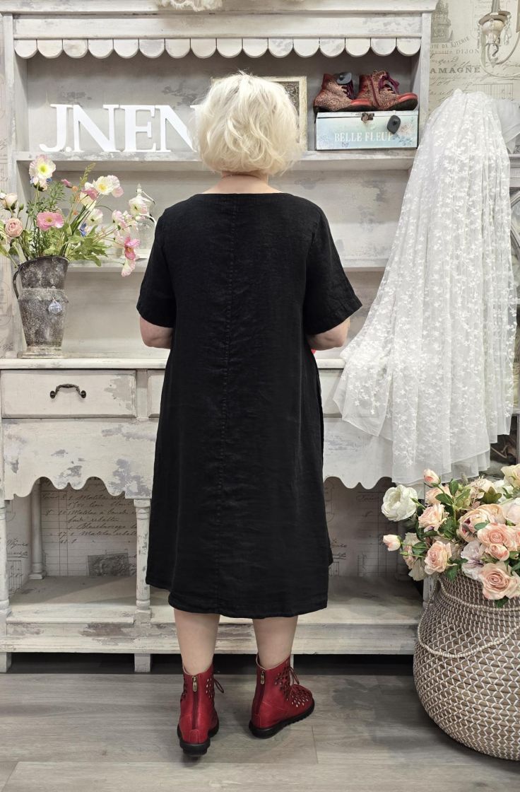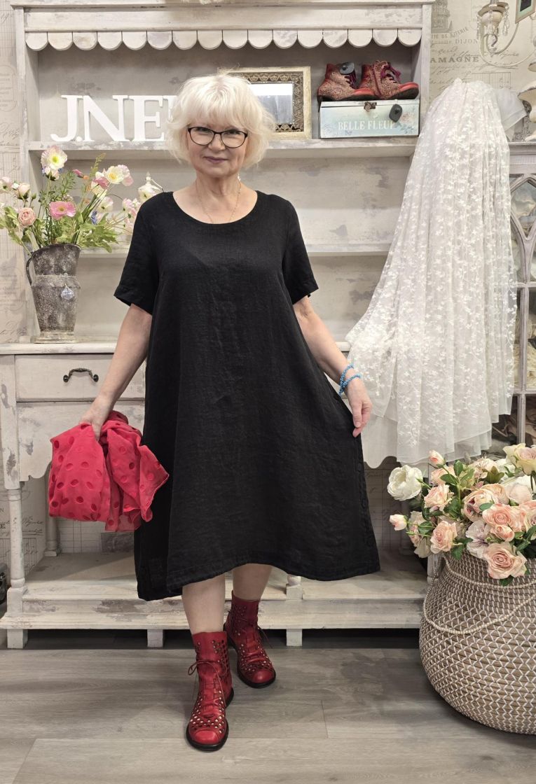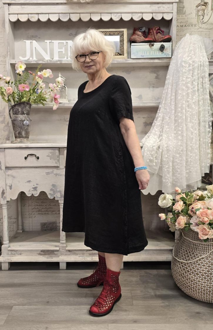 Tyylikäs mekko jonka sivuissa on pitkät halkiot nappi kiinnityksillä. Kangas on todella pehmeää ja hengittävää pellavaa.