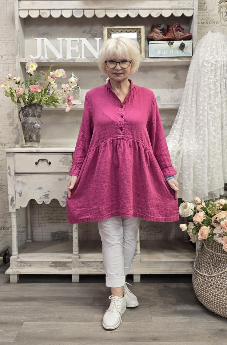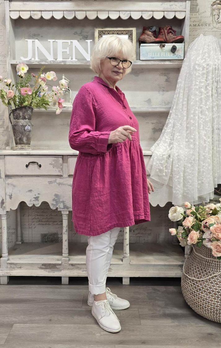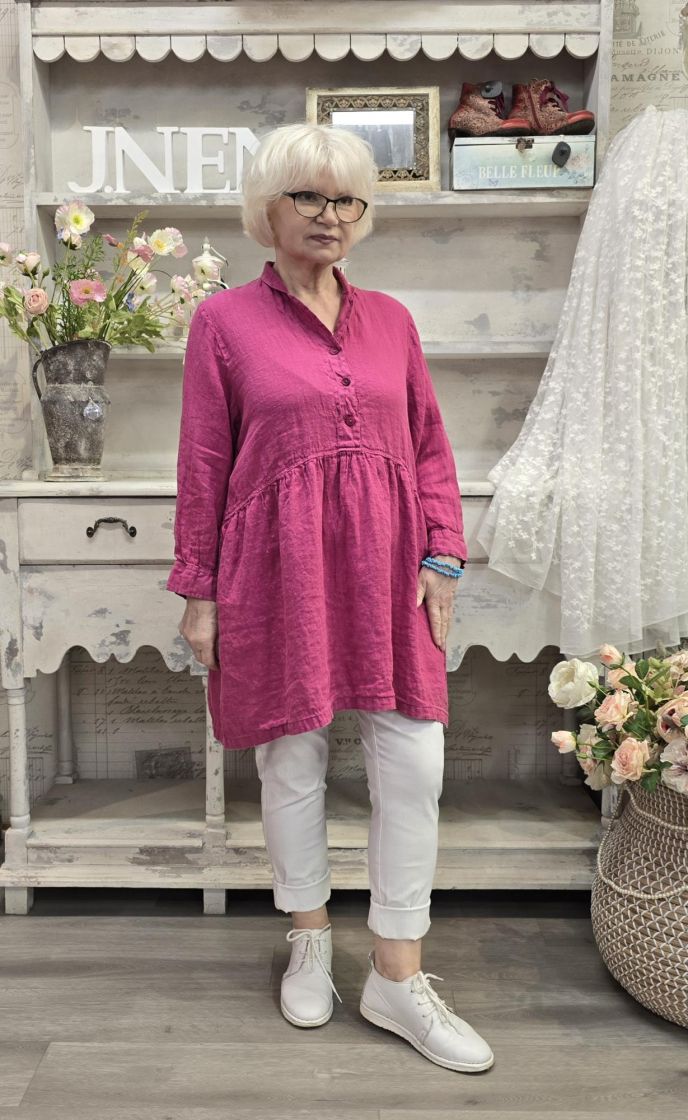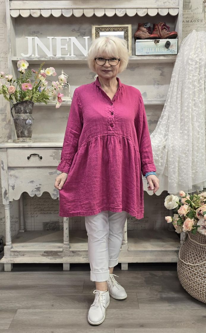 Ihanan tuntuista, ohutta pellavaa Grizas tyylillä! Tässä tunikassa on kaunis napitus poikkileikkaukseen asti, josta taas lähtee romanttiset rypytykset.