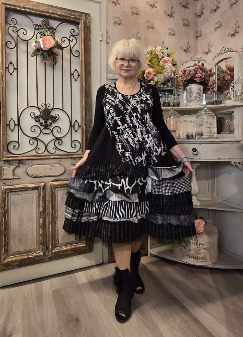 Todella näyttävä ja kaunis mekko jonka upea helma koostuu monista kerroksista eri kuoseja, frilloja ja tylliä.