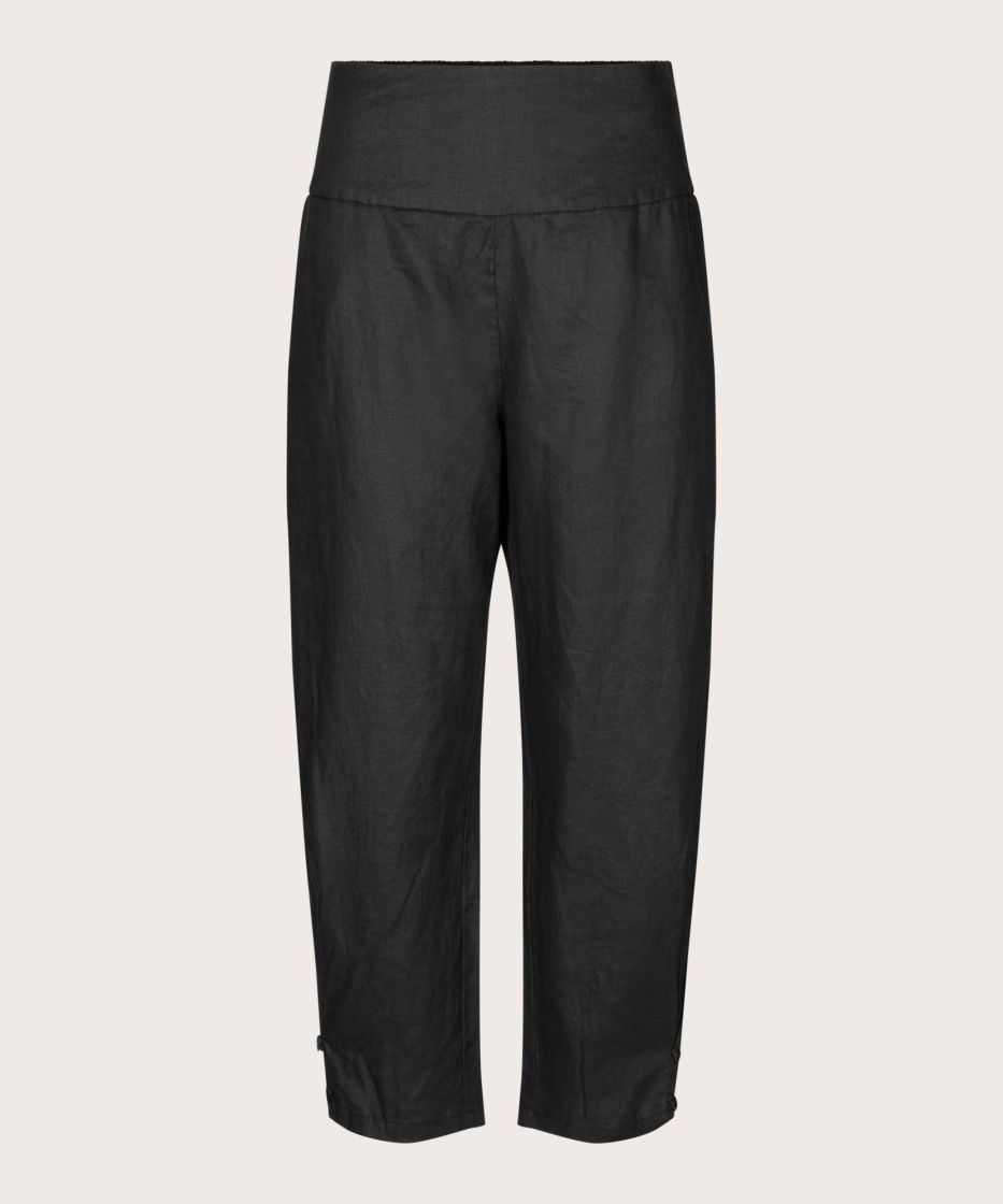 Nämä puhtaasta pellavasta valmistetut housut tarjoavat kevyen, luonnollisen ilmeen ja ilmavan mukavuuden. Todellinen masai-klassikko. Ajattomassa mallissa on leveä, rypytetyllä resorilla varustettu vyötärö, käytännölliset halkiotaskut ja hieman lyhyempi pituus. Täydellinen kesään. Kapeneva istuvuus pienillä napeilla lahkeissa luo naisellisen ja imartelevan siluetin. Yhdistä housut eleganttiin yläosaan tai yksinkertaiseen t-paitaan saadaksesi lookin, joka sopii sekä arkeen että rennon eleganttiin tyyliin.