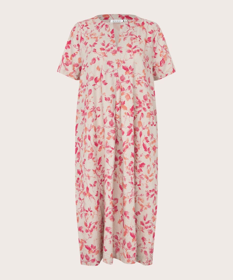 Joitakin tyylejä on vaikea unohtaa, ja tämä naisellinen mekko on ehdottomasti yksi niistä. Oranssinvaaleanpunaisella kukkakuosillaan, joka huokuu auringonpaistetta ja kesää, tämä mekko on valmistettu pehmeimmästä viskoosin ja pellavan sekoituksesta, mikä tekee siitä unelman päällä. Mekossa on yksinkertainen ilme naisellisella halkiolla pääntiessä ja vekillä edessä. A-muotoinen leikkaus antaa sen laskeutua pehmeästi ja mukavasti vartalon yli. Yhdistä se lyhyeen takkiin ja suosikkikoruihisi saadaksesi vaivattomasti naisellisen ilmeen.