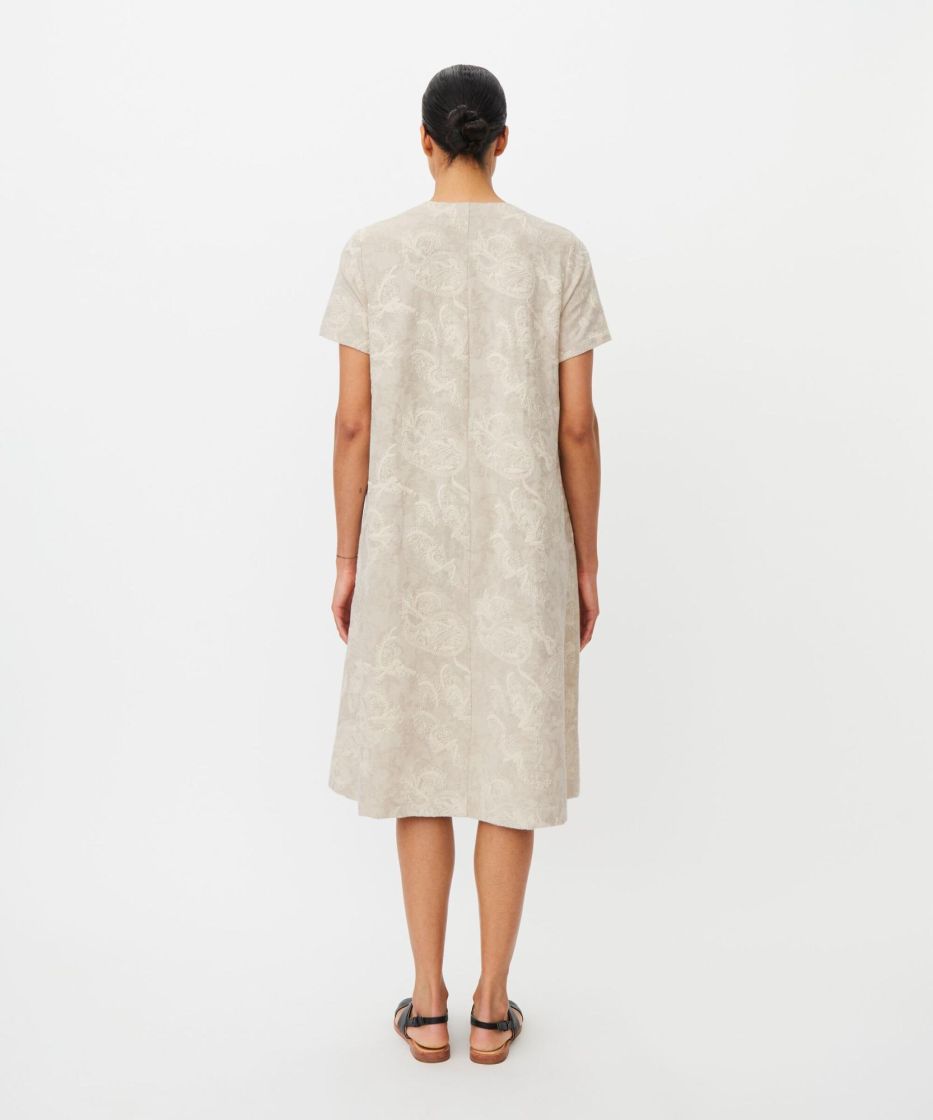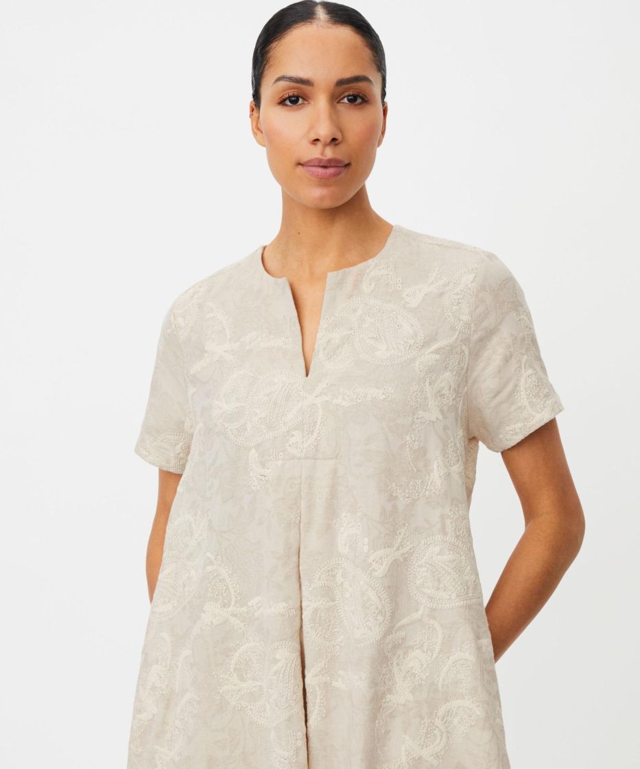 Tämä mekko on niin kaunis, että se on lähes taideteos. Pehmeää puuvillan, pellavan ja viskoosin sekoitusta koristaa upea kirjailtu kukkakuosi, joka lisää tähän asuun tekstuuria. Mekossa on yksinkertainen ilme naisellisilla halkioilla pääntiessä ja laskoksilla edessä. A-muotoinen leikkaus varmistaa, että se laskeutuu kauniisti vartalon yli. Huomaamattomat sivuilla olevat halkiotaskut. Yhdistä mekko kultaisilla koruilla korostaaksesi ylellistä ilmettä.