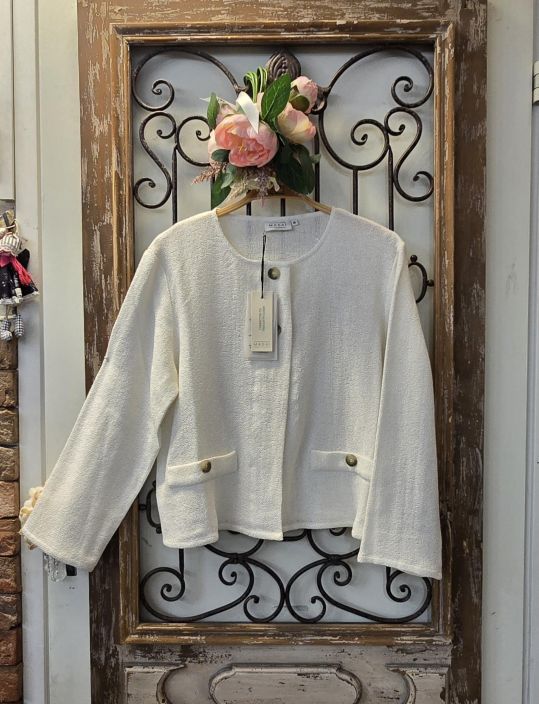 Ajaton ja persoonallinen buklee on oikotie ylelliseen tyyliin. Tämä yksinkertainen buklee jakku on koristeltu kauniilla napeilla, jotka tuovat lisäelämystä. Se istuu kauniisti hartioille ja laskeutuu pehmeästi vartaloa pitkin. Yhdistä räätälöityihin housuihin, naiselliseen paitaan ja huiviin saadaksesi tyylikkään kerrostetun ilmeen.