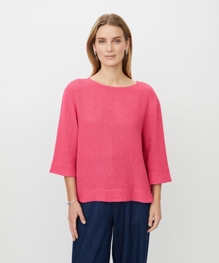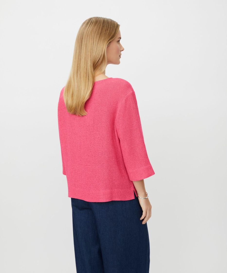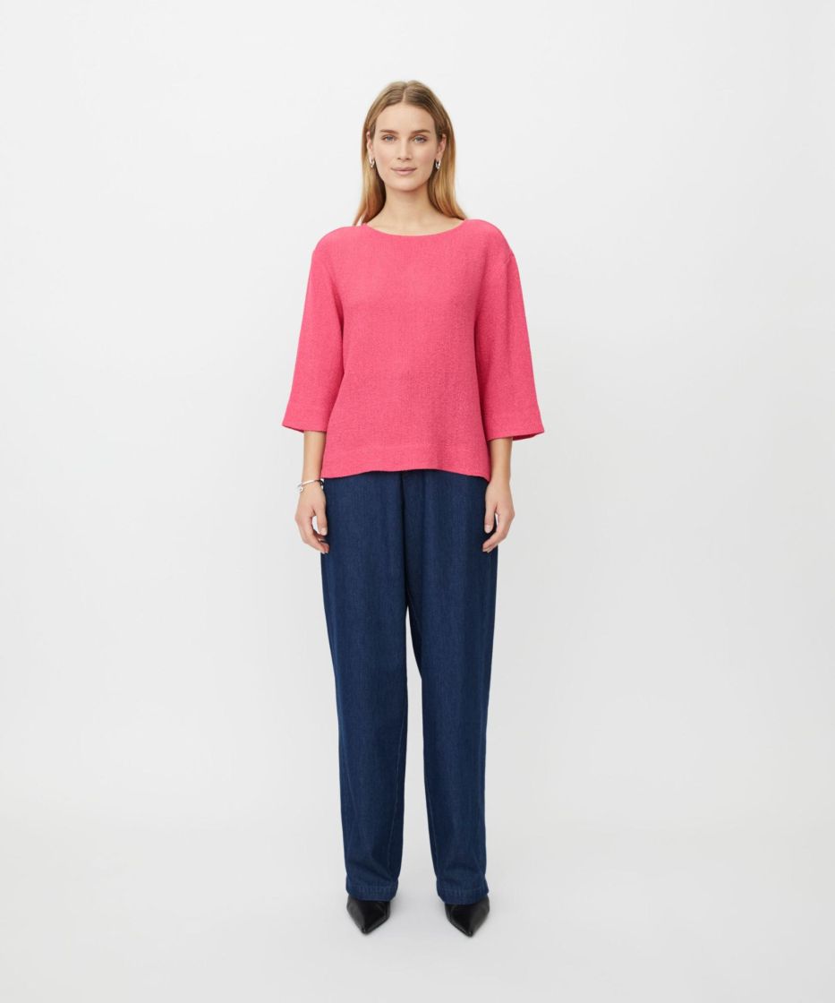Bouclé-kankaan kaunis rakenne on oikotie ylelliseen ilmeeseen. Tässä pehmeästä bouclé-kankaasta valmistetussa yläosassa on yksinkertainen ja tyylikäs muotoilu, pyöreä pääntie, kolmeneljäsosahihat ja pienet sivuhalkiot. Klassinen leikkaus suorilla linjoilla antaa yläosan laskeutua kauniisti vartalon myötäisesti ja varmistaa mukavan istuvuuden. Käytä sitä sellaisenaan tai esim. paidan tai ohuen poolopaidan kanssa saadaksesi elegantin kerrostetun ilmeen.