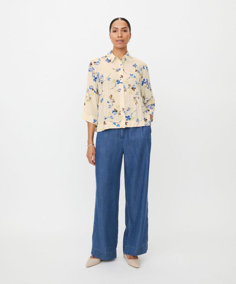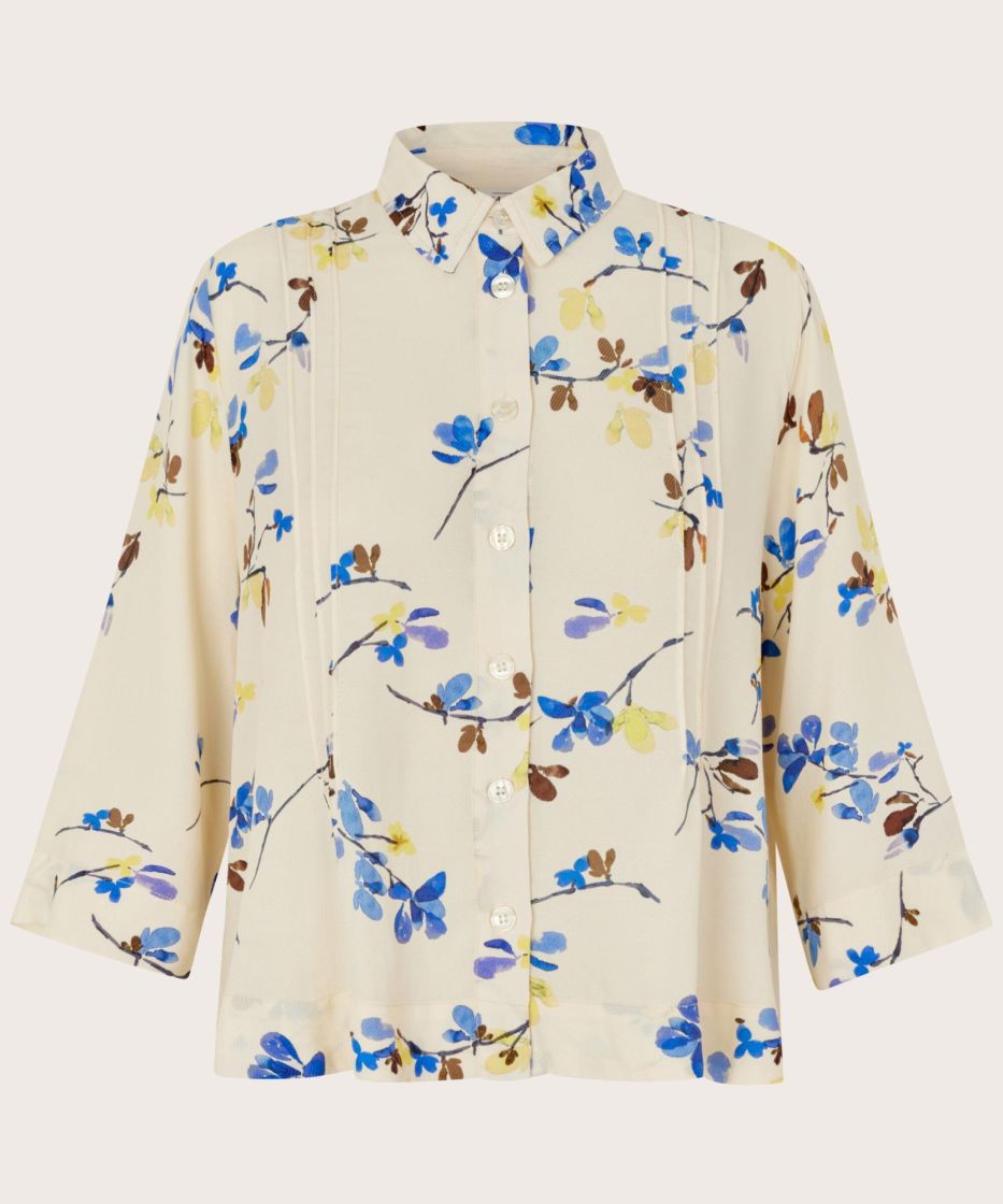 Tämä kaunis viskoosipaita tuntuu pehmeältä ja kevyeltä ihoa vasten. Lyhyt, laatikkomainen leikkaus koristeellisilla hiuslaskoksilla ja pienillä halkioilla antaa paidalle tyylikkään ilmeen ja runsaasti liikkumisvapautta. Kukkakuvio lisää elegantin ja naisellisen silauksen, joten se sopii täydellisesti sekä arkeen että tyylikkäisiin tilaisuuksiin. Yhdistä se farkkujen tai yksinkertaisten housujen kanssa huolettoman ja tyylikkään ilmeen saavuttamiseksi.