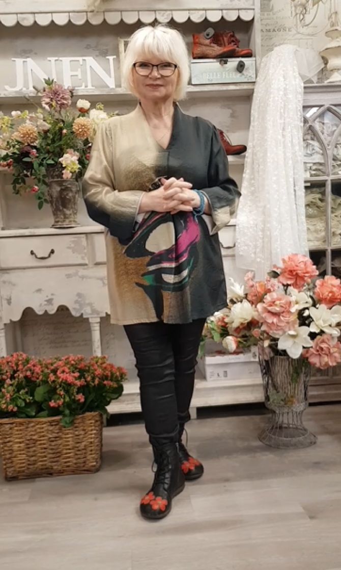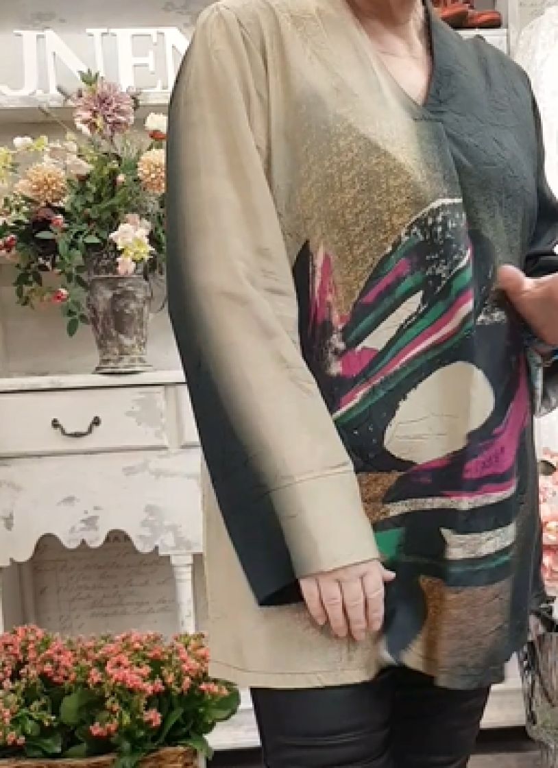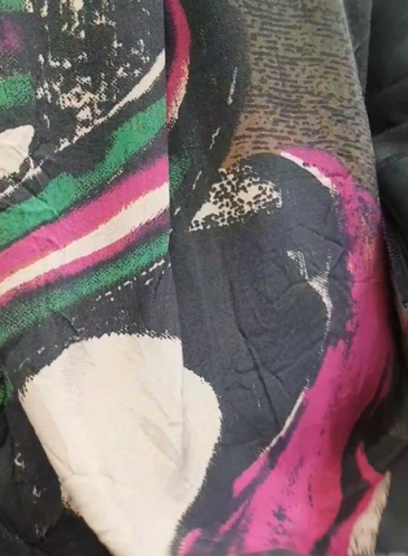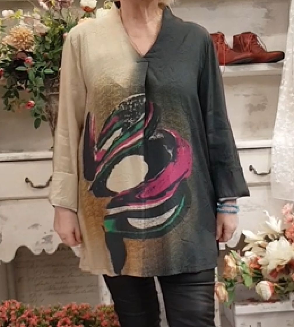 Materiaali: 100% viskoosi. Todella pehmeä ja kitkaton laatu joka myös hengittää hyvin. Tuntuu iholla mukavasti viileältä.Abstrakti ja taiteellinen kuosi komplementoi simppeliä mallia.