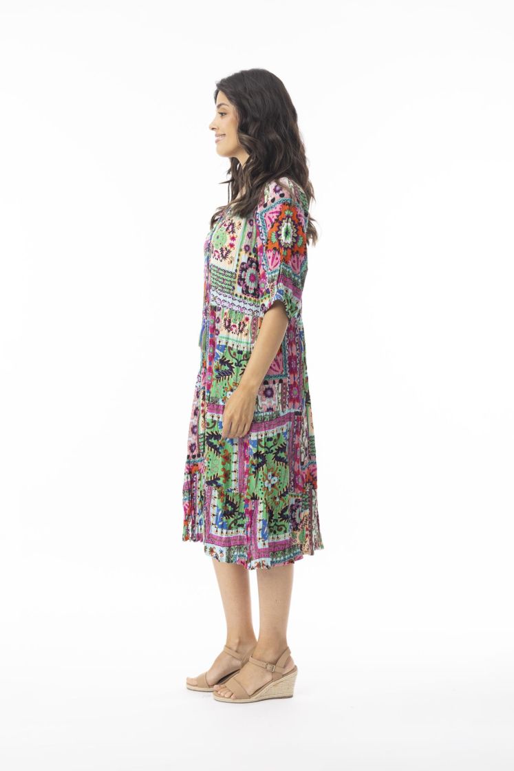 Sivuissa mekossa on taskut.
