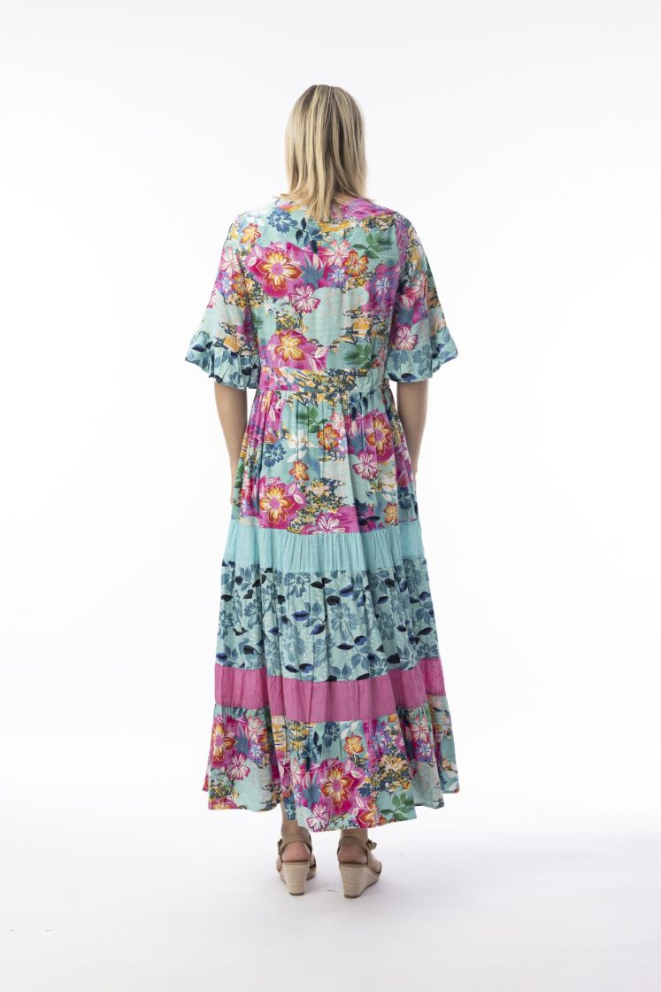 Tämän mekon kankaissa yhdistyvät ihanan väriset kuosit sekä tekstuurit.