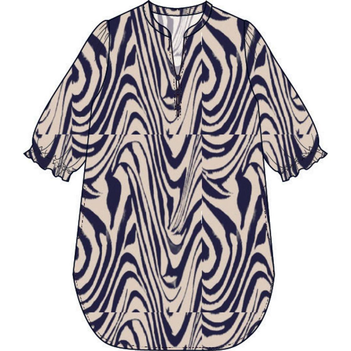 Elegantti ja kevyt tunika, jossa on kaunis graafinen kuvio, joka luo tyylikkään ja modernin ilmeen. Pehmeä viskoosikangas tuntuu mukavalta ihoa vasten ja laskeutuu kevyesti vartalon ympärille.