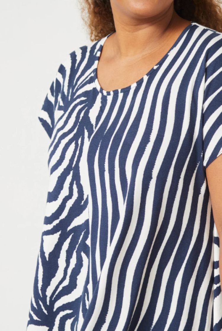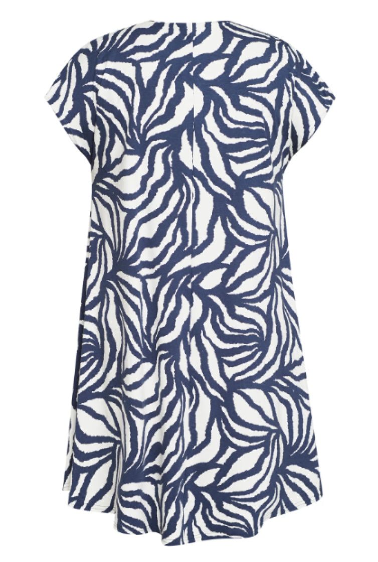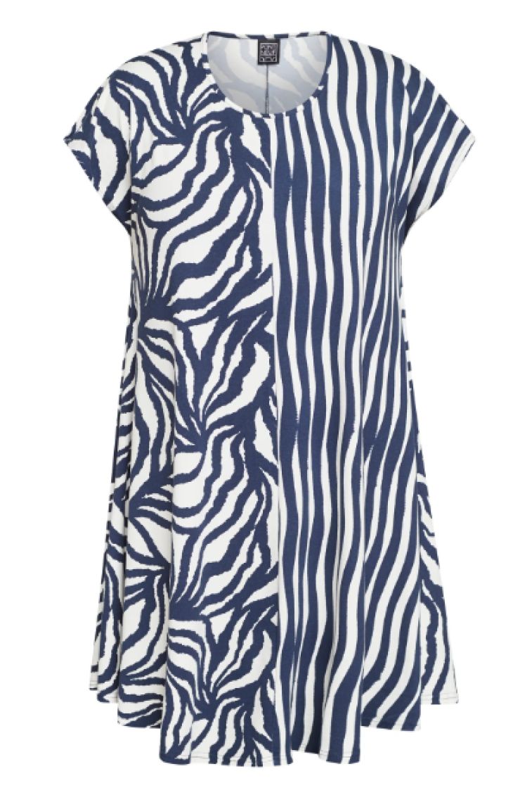 Kevyt ja elegantti mekko, jossa on moderni raitakuvio ja imarteleva A-leikkaus. Pehmeä ja joustava kangas takaa mukavan istuvuuden ja antaa mekolle kauniin laskeutumisen. Lyhyet hihat ja pyöreä pääntie korostavat klassista ilmettä, kun taas dynaamiset raidat lisäävät modernia ilmettä.