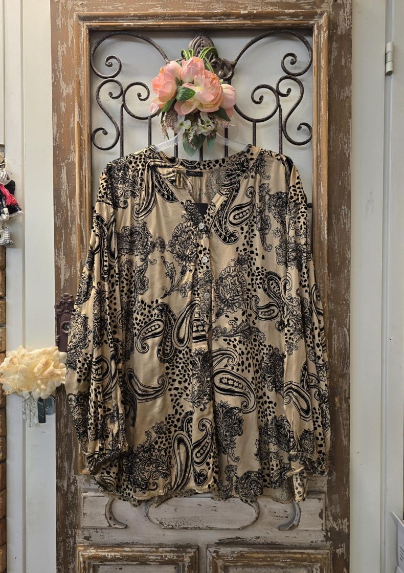 Tämä paita QNUZ mallistosta on todella pehmeä ja ajattoman tyylikäs. Kangas on pohjaltaan pehmeää viskoosi satiinia ja siihen on päälle ommeltu kaunis musta sametti kuosi.