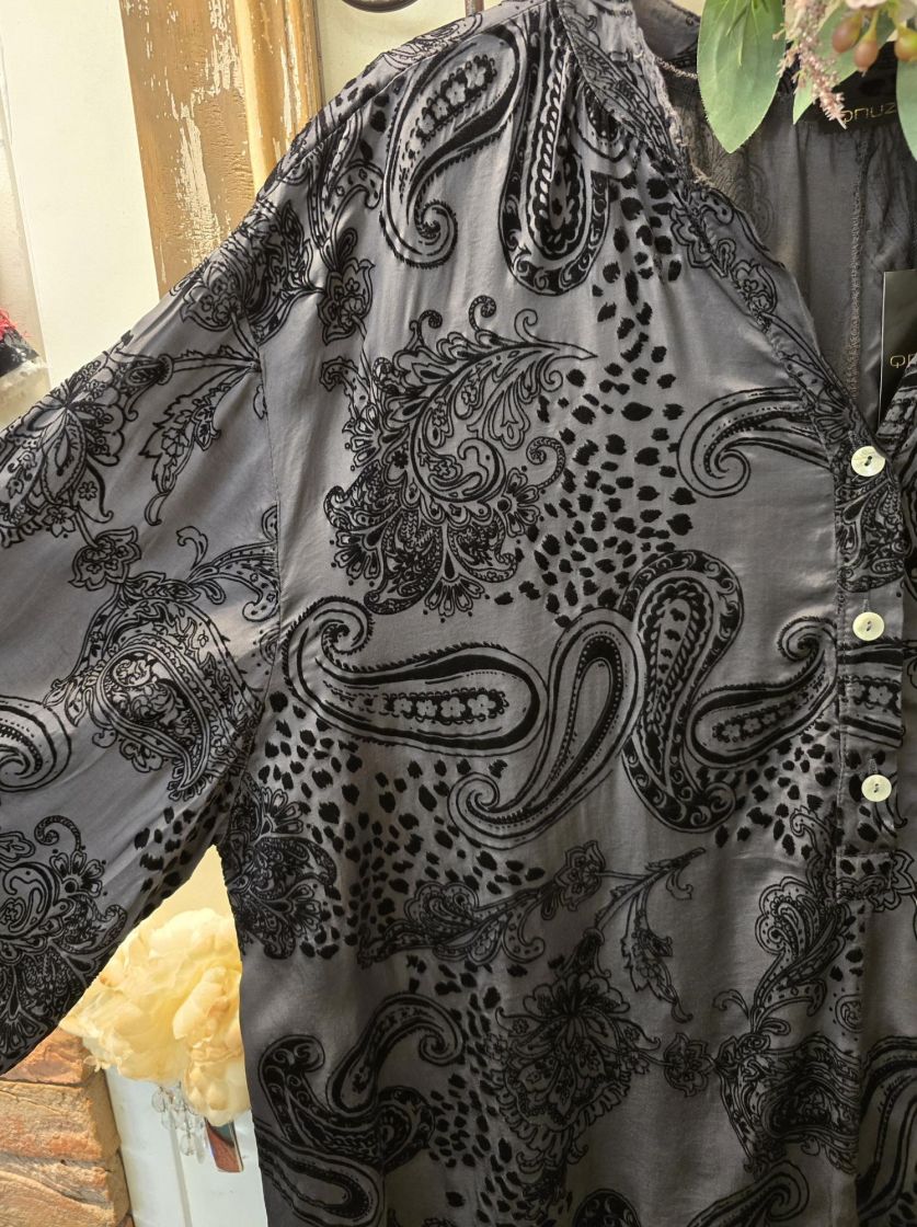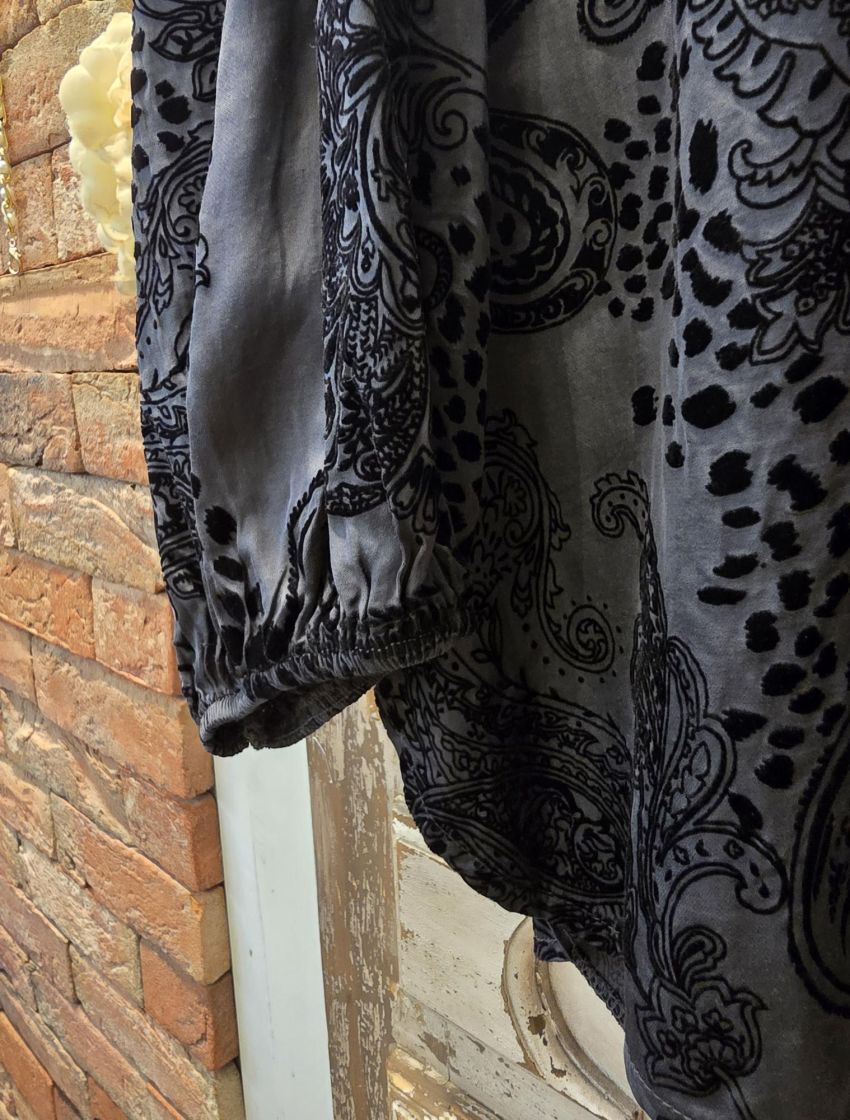 Tämä paita QNUZ mallistosta on todella pehmeä ja ajattoman tyylikäs. Kangas on pohjaltaan pehmeää viskoosi satiinia ja siihen on päälle ommeltu kaunis musta sametti kuosi.
