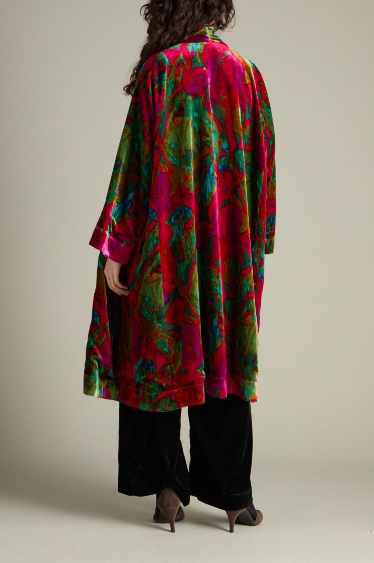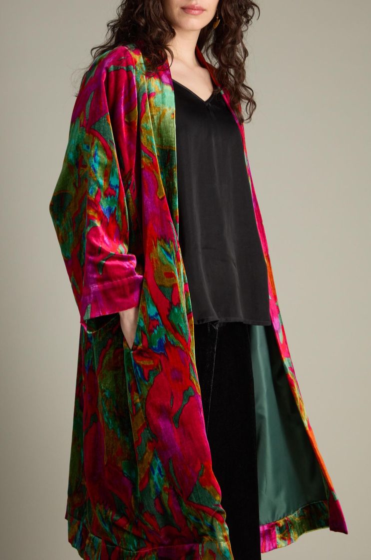 Japanilainen kimono-tyylinen tilava jakku jossa on upea samettinen, hieman kiiltävä pinta syksyn väreissä.