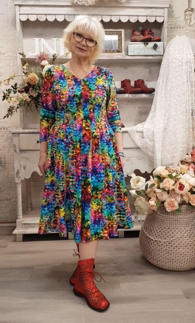 Kotimaisen AINO malliston upea värikäs UUTUUS kuosi koristaa tätä tyylikästä ja pirteää mekkoa joka on valmistettu kangas kaistaleista. Kaistaleet tuovat malliin kauniin laskeutumisen ja jakavat kuosia hauskasti.