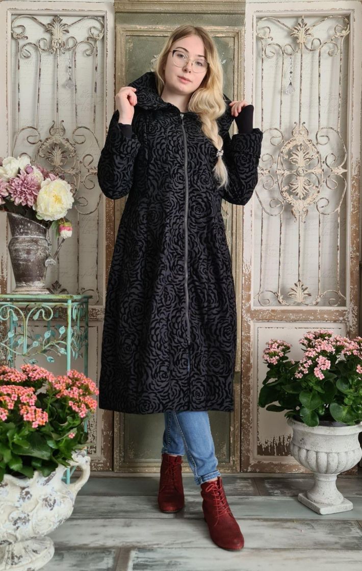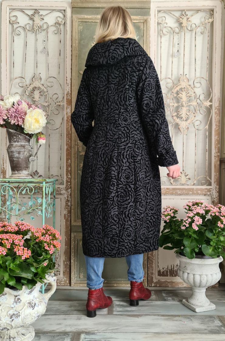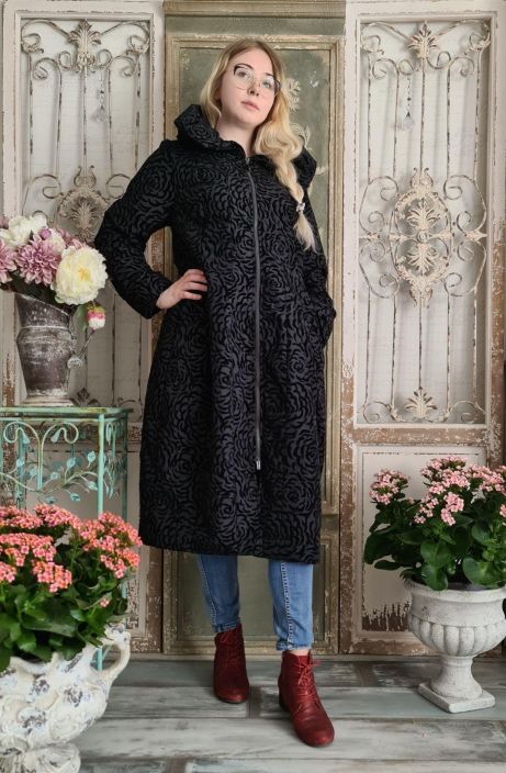 Näyttävä, todella tyylikäs ja uniikki takki kotimaiselta Ainolta! Musta pohja jossa samettiset ruusut. Vanutäyte. Kangas hylkii vettä ja pitää tuulta. Siro ja kaunis malli isolla kauluksella, vetoketjulla ja taskuilla. Kavennettu helma saa aikaan hoikentavan vaikutuksen. Upea punainen vuori.