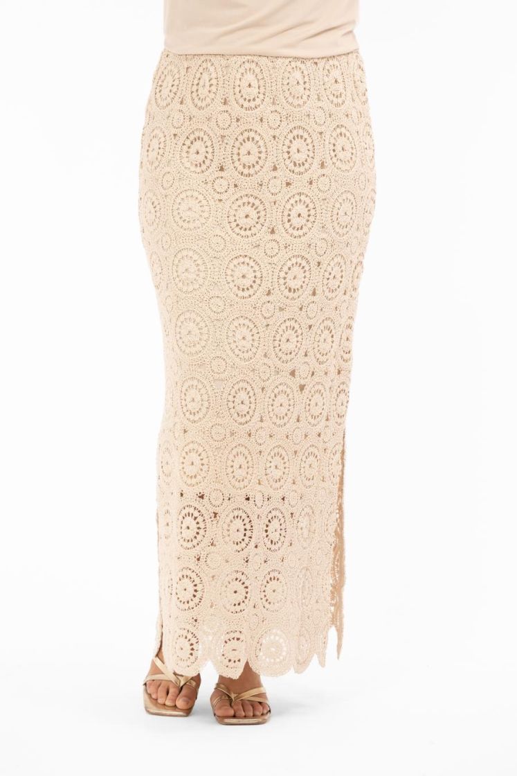 Luo trendikäs ilme Freya-hameella, jossa on virkattu kaunis kangas! Hame on hieman a-linjainen ja siinä on sivusaumojen halkiot liikkuvuutta ja tyylikkäitä yksityiskohtia varten. Leveä vyötärönauha on valmistettu kudotusta materiaalista, jossa on pehmeä resori mukavan ja imartelevan istuvuuden takaamiseksi. Hame on osittain vuorattu halkioiden kohdalla mukavuuden ja tyylikkään laskeutumisen takaamiseksi. Trendikäs ja naisellinen hame, joka sopii täydellisesti arkeen, juhliin tai erityistilaisuuksiin.