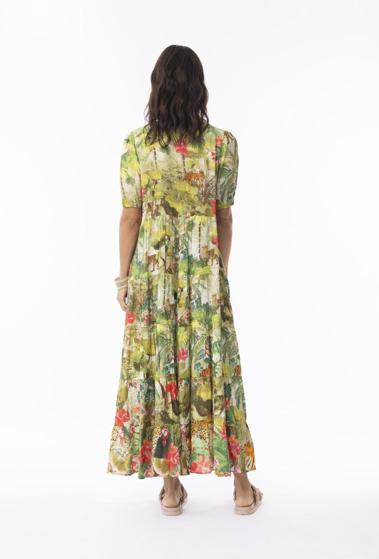 Pitkä mekko näyttävällä helmalla.
