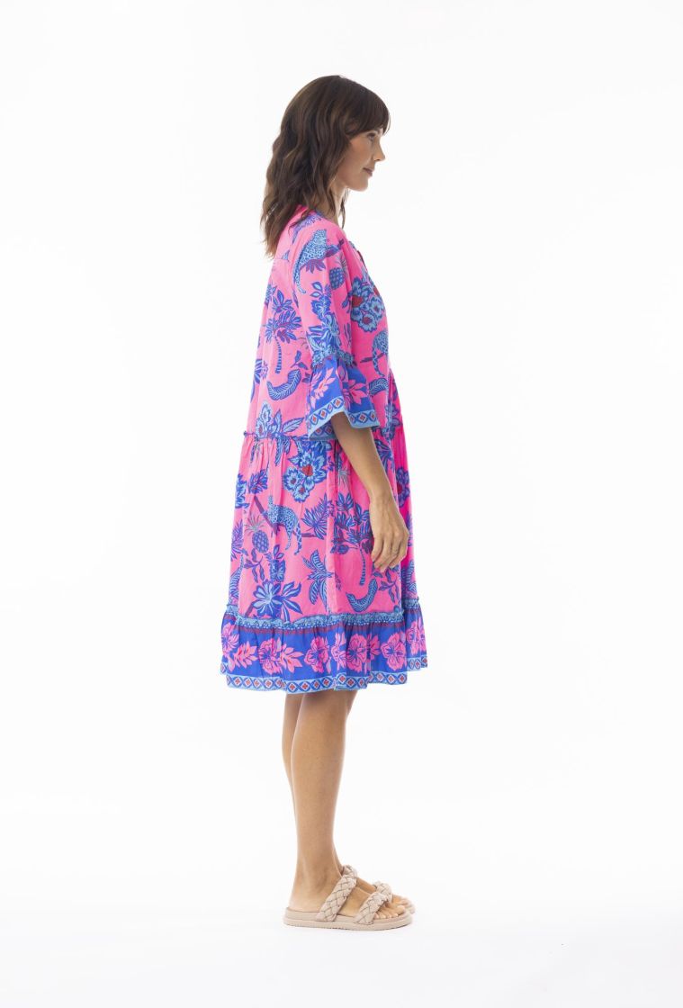 Ihanilla kerroksilla koristeltu Escape mekko! Upea yhdistelmä pinkkiä ja sinistä trooppisessa kuosissa.