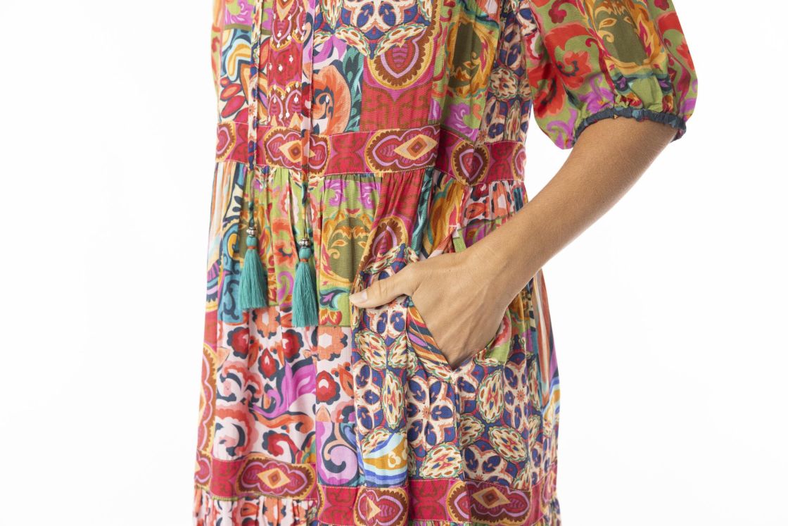 Pyöreä pääntie jossa koristeena nauhat tupsuilla, naisellinen halkio ja kiiltävät yksityiskohdat.