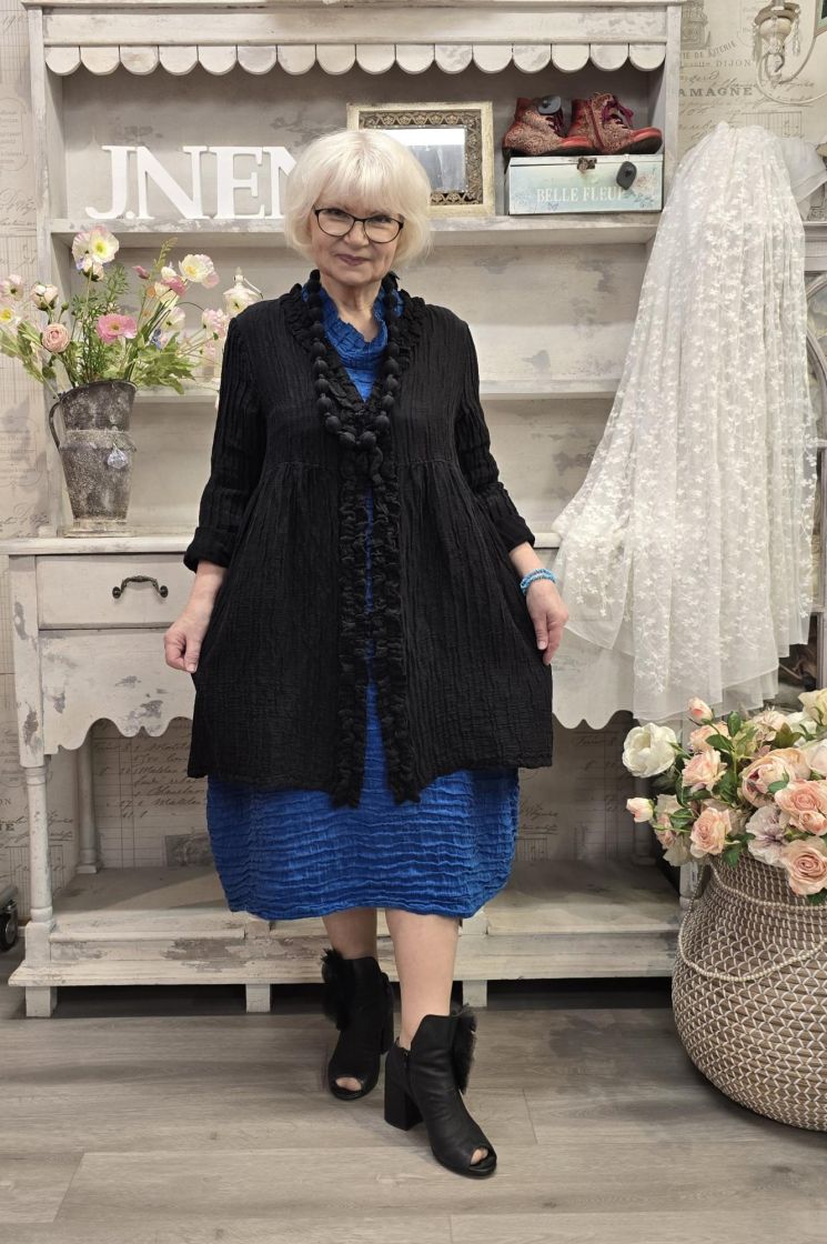 Tämä uniikin mallinen Grizas jakku on valmistettu klassikko silkki/pellava laadusta ja siihen on ommeltu kaunis tekstuuri.