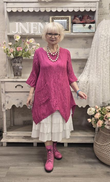 Tästä luonnollisesta tunikasta tulee hetkessä vaatekaappisi suosikki. Se on leikattu ryppyisestä pellava/silkkikankaasta ja siinä on epäsymmetrinen helma, jota korostaa söpö sivutasku. Pue tunika housujen tai leggingsien kanssa.
