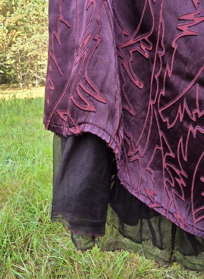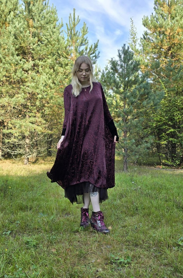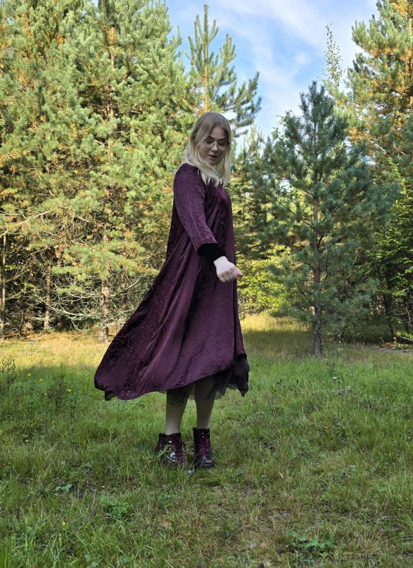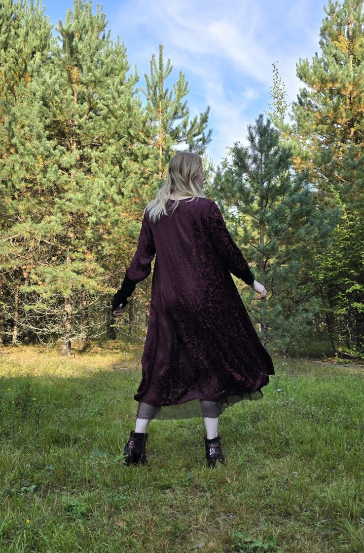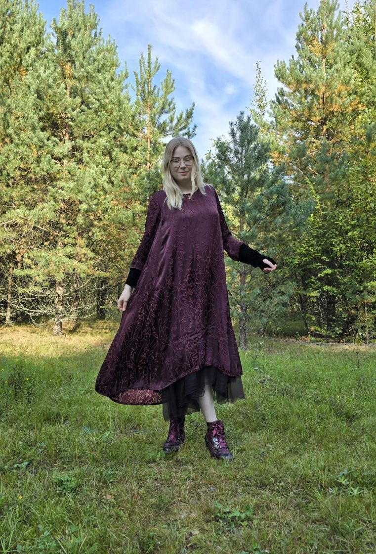 Materiaali: päällyskangas jossa on ihana kuosi on 65% viskoosia, 35% silkkiä. Todella mukava ja hyvin hengittävä laatu. Alushame joka on ommeltu mekkoon ylhäällä on 100% ihoa hellivää silkkiä.
