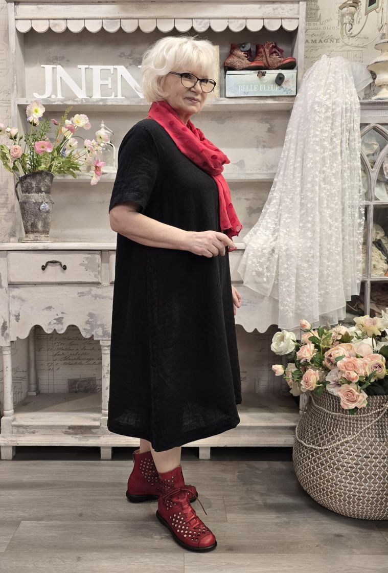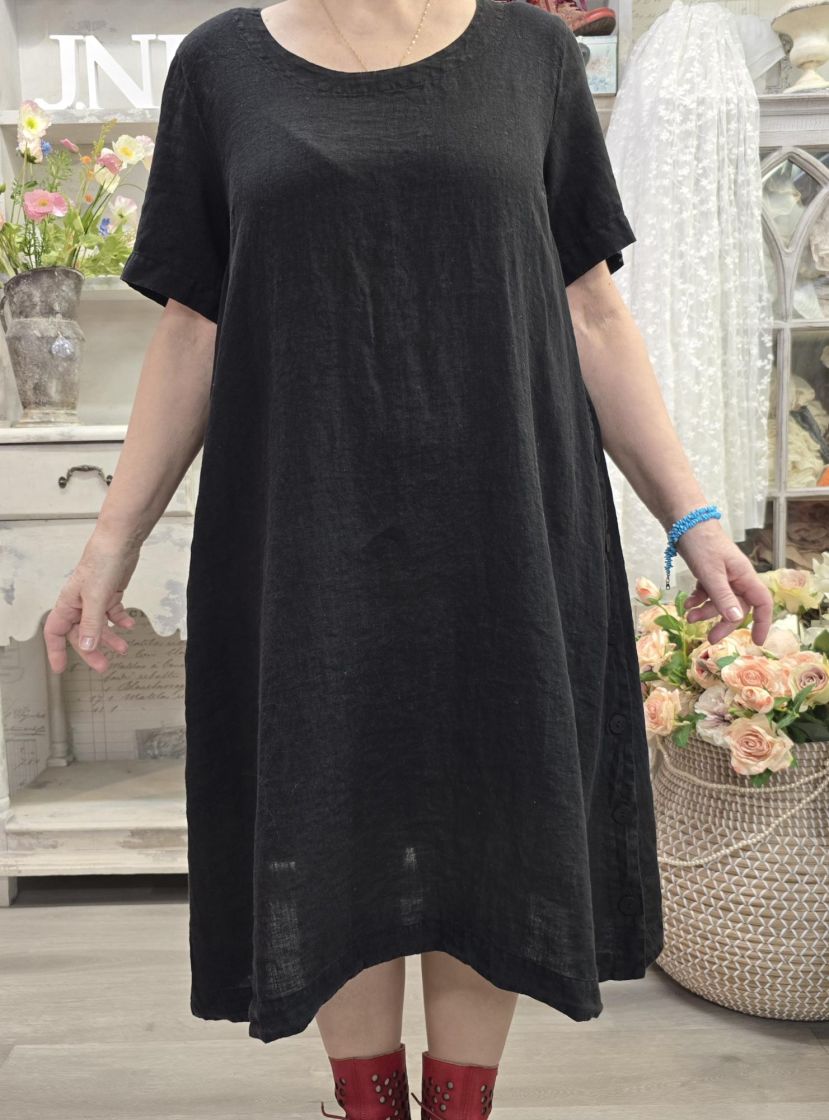 Tyylikäs mekko jonka sivuissa on pitkät halkiot nappi kiinnityksillä. Kangas on todella pehmeää ja hengittävää pellavaa.