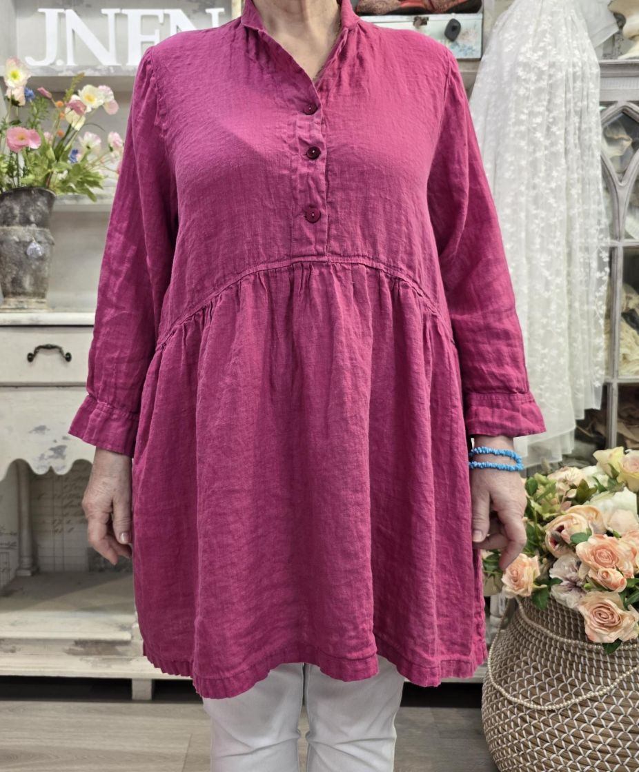 Ihanan tuntuista, ohutta pellavaa Grizas tyylillä! Tässä tunikassa on kaunis napitus poikkileikkaukseen asti, josta taas lähtee romanttiset rypytykset.