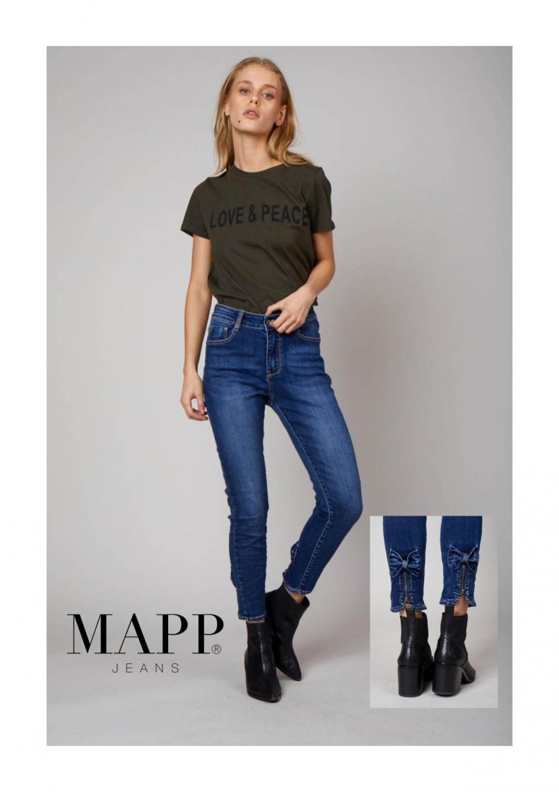 M.A.P.P. malliston kestosuosikki on täällä! Upeat puuvilla farkut takaavat erinomaisen istuvuuden jouston ja mukavan laadun avulla. Myös vyötärö joustaa! Ihanat rusetti yksityiskohdat vetoketjuilla lahkeiden takana, taskut ja vyölenkit. Käytä minkä vain asun kanssa!
