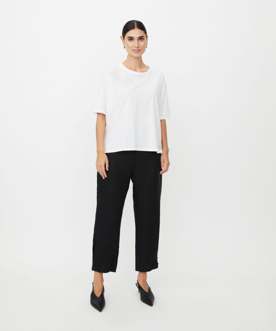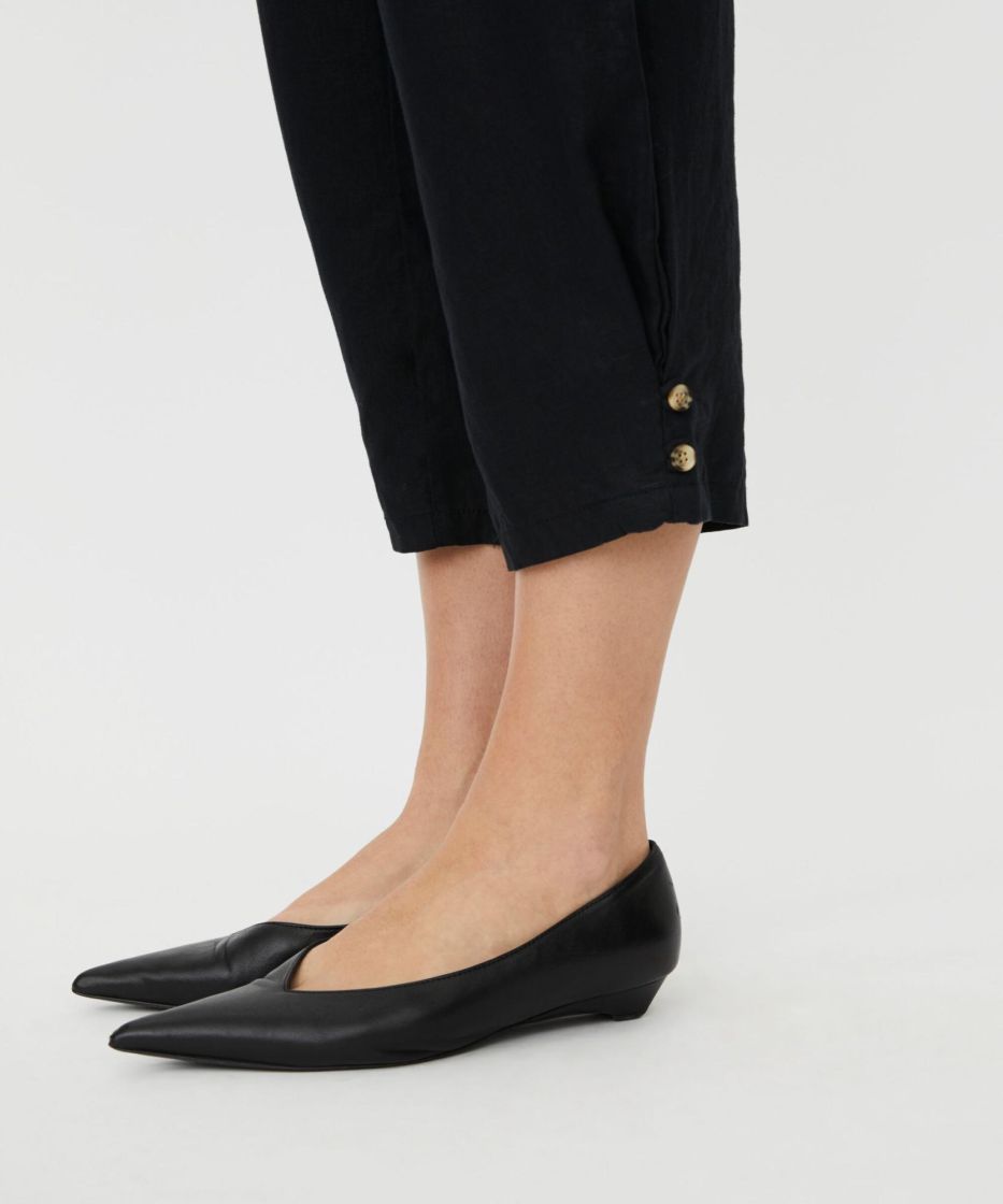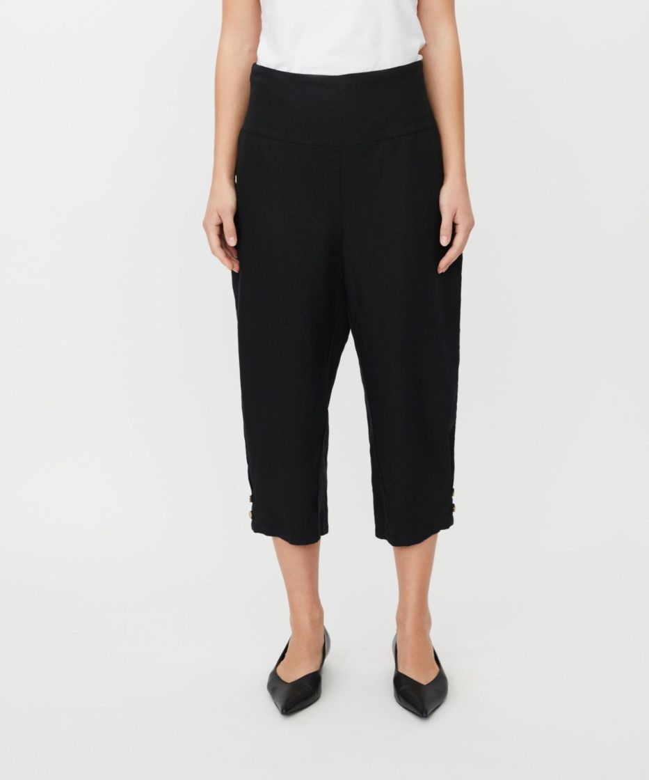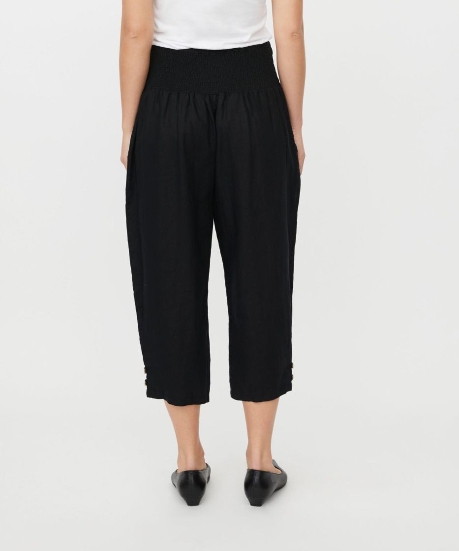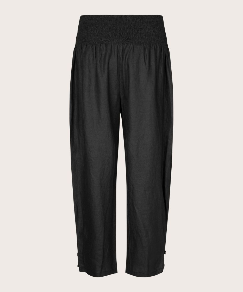 Nämä puhtaasta pellavasta valmistetut housut tarjoavat kevyen, luonnollisen ilmeen ja ilmavan mukavuuden. Todellinen masai-klassikko. Ajattomassa mallissa on leveä, rypytetyllä resorilla varustettu vyötärö, käytännölliset halkiotaskut ja hieman lyhyempi pituus. Täydellinen kesään. Kapeneva istuvuus pienillä napeilla lahkeissa luo naisellisen ja imartelevan siluetin. Yhdistä housut eleganttiin yläosaan tai yksinkertaiseen t-paitaan saadaksesi lookin, joka sopii sekä arkeen että rennon eleganttiin tyyliin.