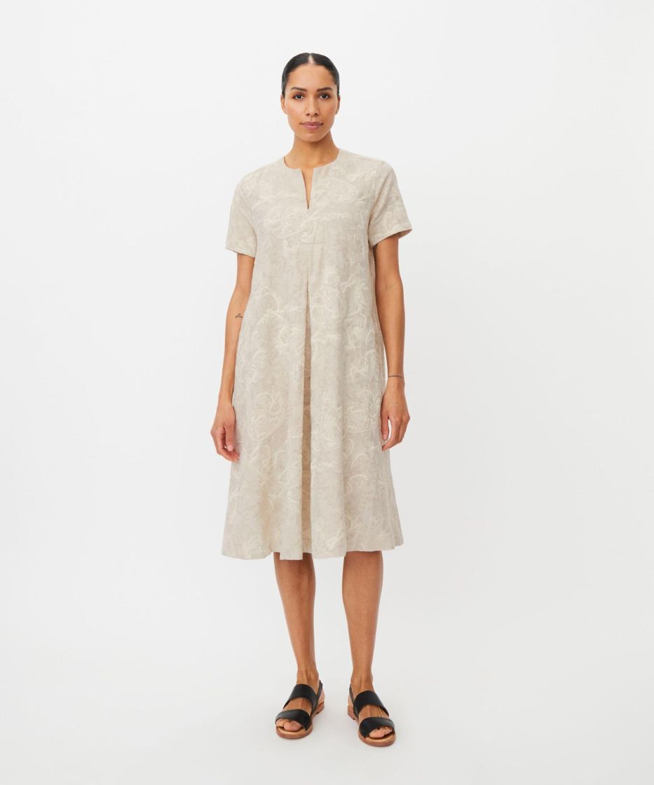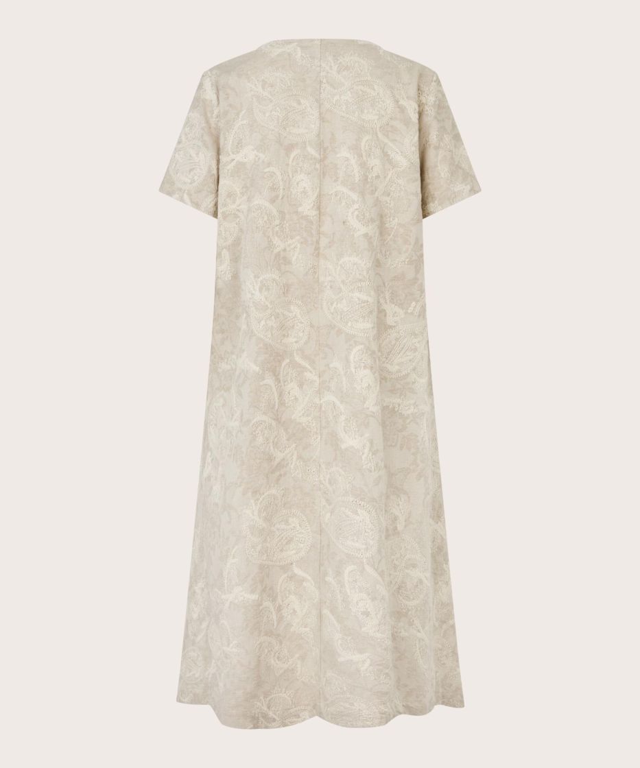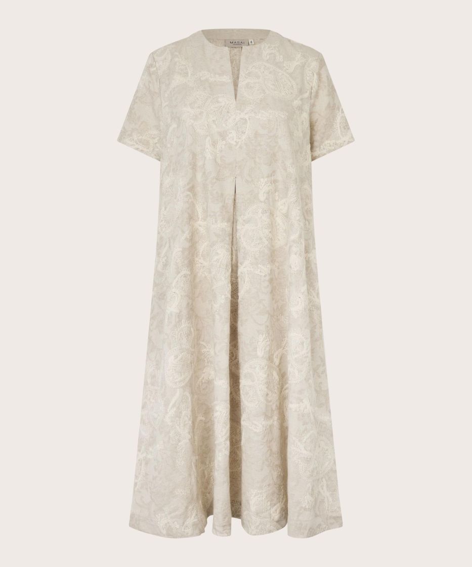 Tämä mekko on niin kaunis, että se on lähes taideteos. Pehmeää puuvillan, pellavan ja viskoosin sekoitusta koristaa upea kirjailtu kukkakuosi, joka lisää tähän asuun tekstuuria. Mekossa on yksinkertainen ilme naisellisilla halkioilla pääntiessä ja laskoksilla edessä. A-muotoinen leikkaus varmistaa, että se laskeutuu kauniisti vartalon yli. Huomaamattomat sivuilla olevat halkiotaskut. Yhdistä mekko kultaisilla koruilla korostaaksesi ylellistä ilmettä.