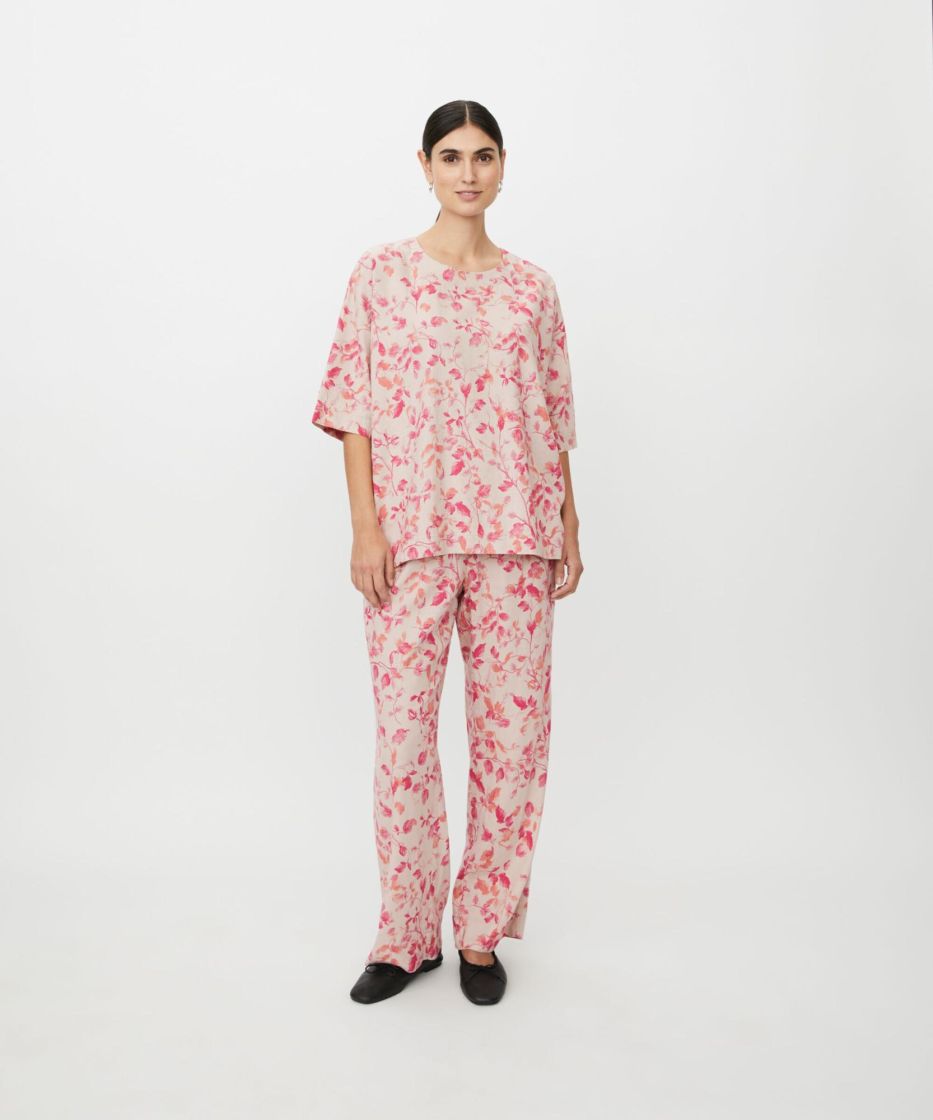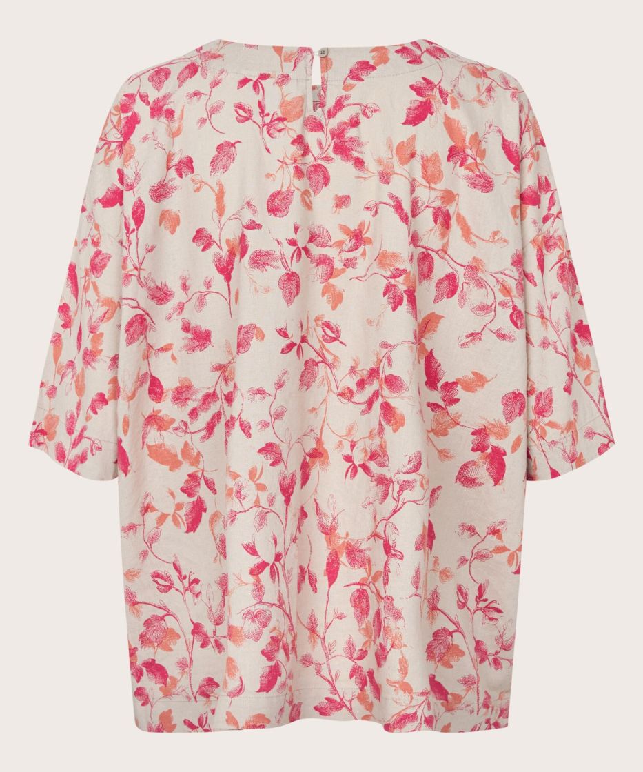 Tämä kaunis kukkakuosi on yksinkertaisesti lumoava ja lisää tyyliisi raikkaan, naisellisen silauksen. Toppi on valmistettu kevyestä pellavan ja viskoosin sekoituksesta, ja se tuntuu pehmeältä, ilmavalta ja mukavalta ihoa vasten. Mallissa on pyöreä pääntie, lyhyet sivuhalkiot ja huomaamaton halkio pääntiessä, jossa on nappikiinnitys takana. Rento, oversize-leikkaus tarjoaa erinomaisen liikkumisvapauden, joten toppi sopii täydellisesti farkkujen, pillihousujen tai shortsien kanssa.