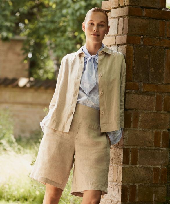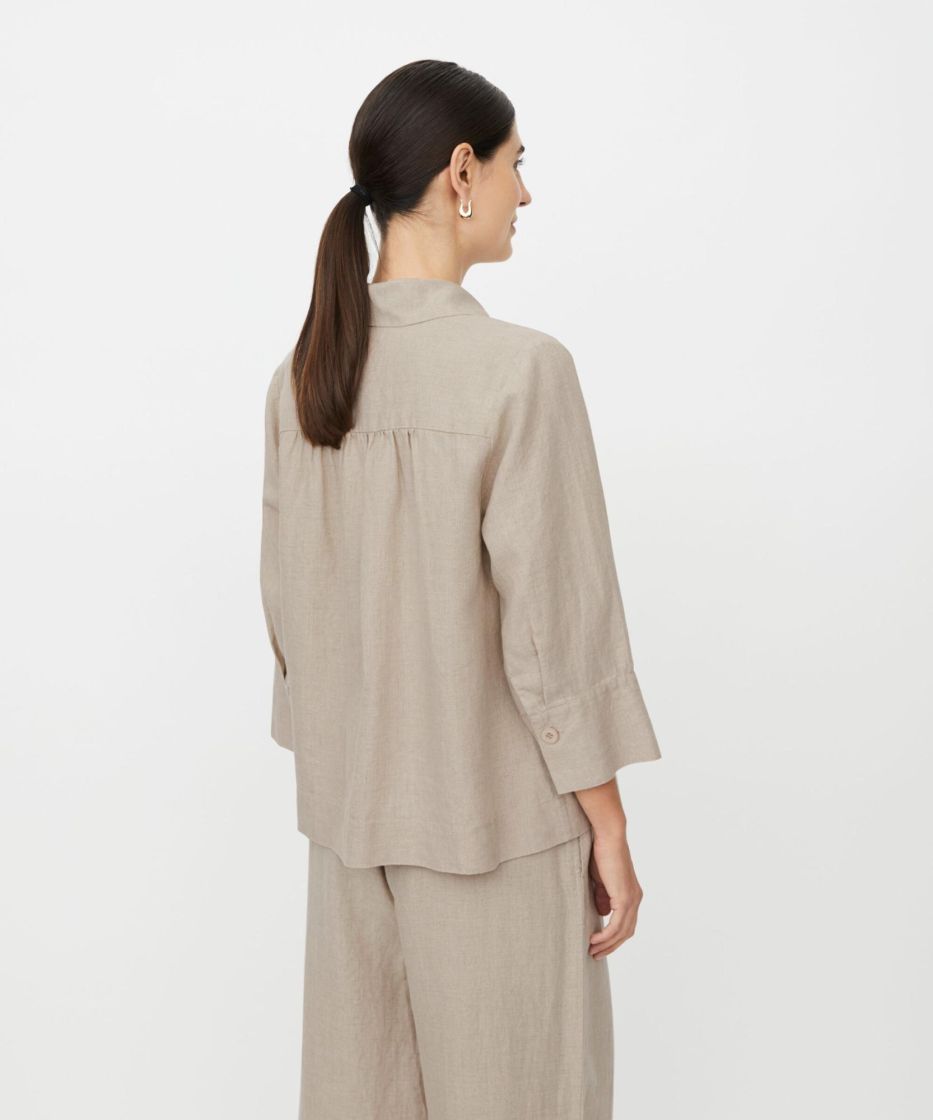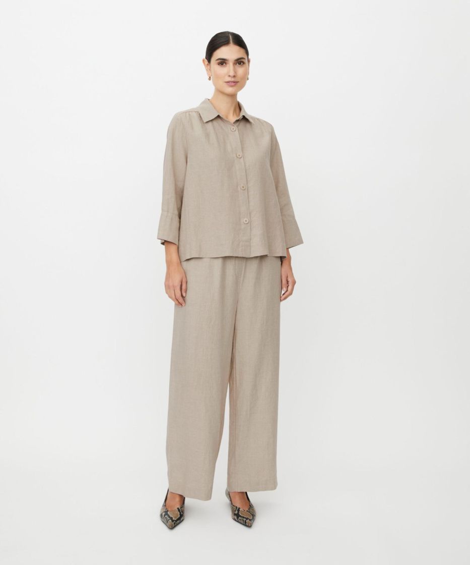 Parhaat mallit sopivat yhteen monella eri tavalla, ja tämä pellavapaita toimii täydellisesti sekä paitana että kevyenä jakkuna. Paidassa on naisellinen ja ajaton ilme, klassinen kaulus, väriin sovitetut napit ja leveät kolmeneljäsosahihat. Yhdistä se kevyesti kerrospukeutumiseen naisellisen yläosan tai paidan kanssa tai luo pehmeä puku yhteensopivien housujemme avulla.