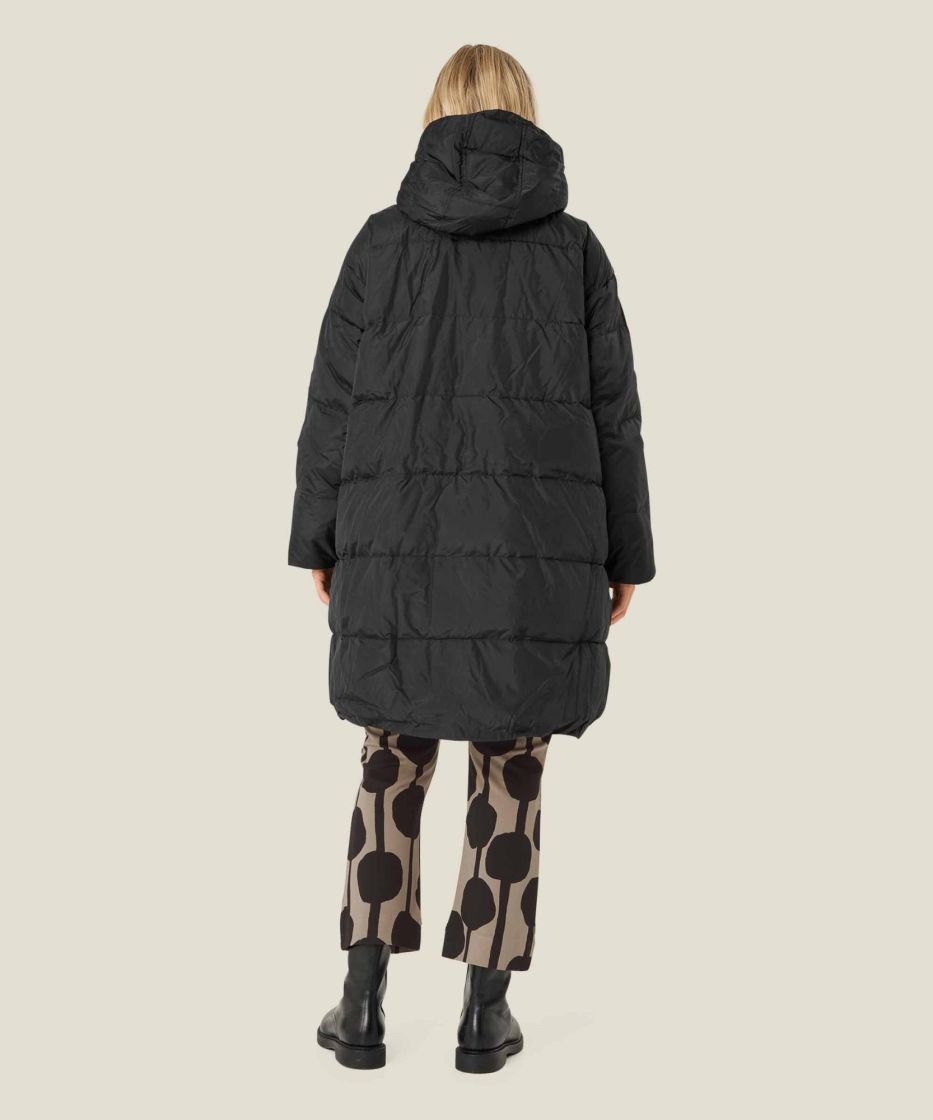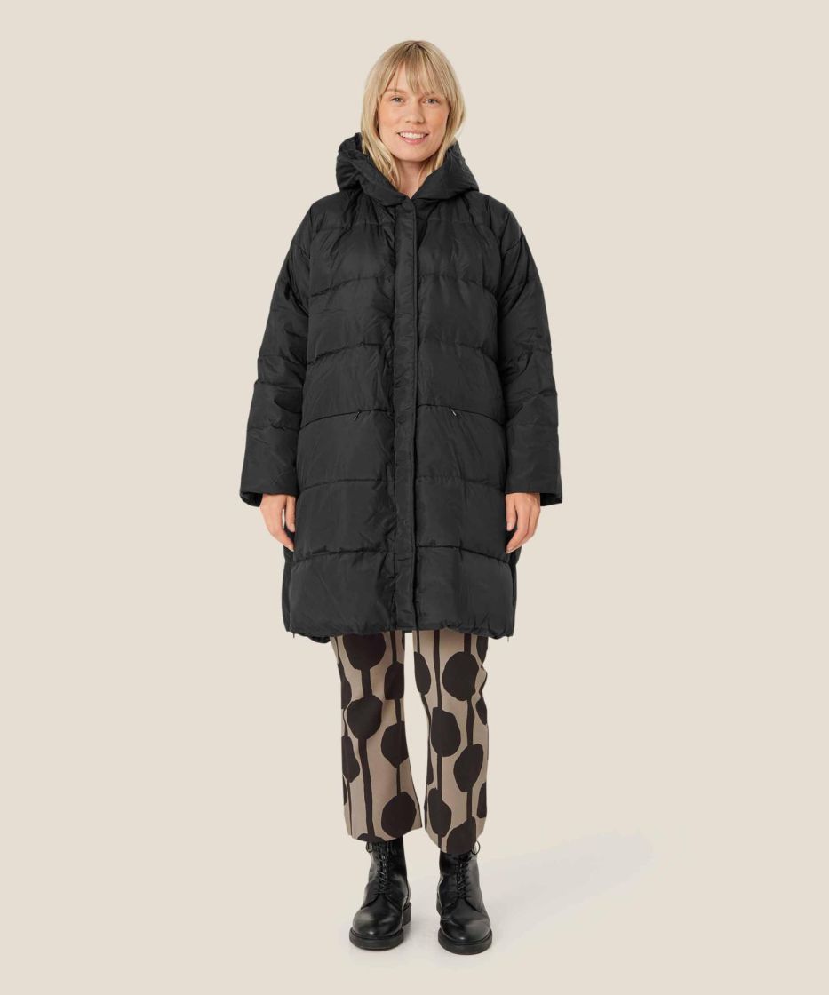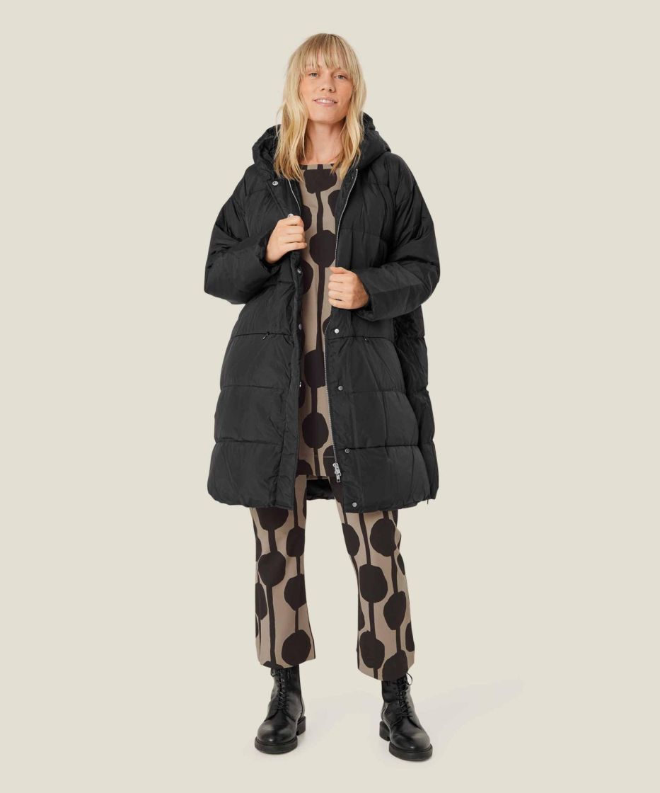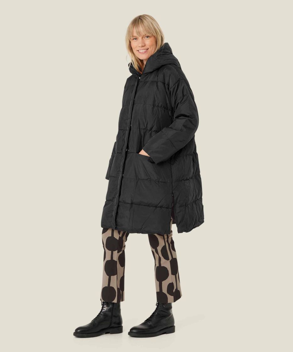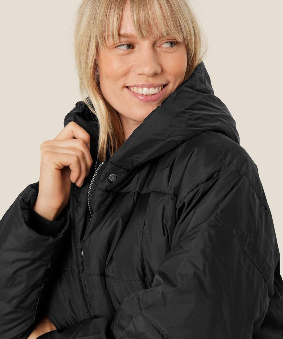 Aktiivinen elämäntapa vaatii päällysvaatteita, joissa voit liikkua vapaasti. Tämä tyylikäs untuvatakki ajattomassa mustassa ja hupulla yhdistää toimivuuden ja tyylin. Se on suunniteltu vaakasuuntaisilla ompeleilla, jotka pitävät untuvan paikoillaan ja luovat naisellisen ja fiksun vaikutelman. Se on pehmeä, lämmin ja tarjoaa runsaasti mukavuutta rennon oversize-leikkauksensa ansiosta. Nauti käytännöllisistä yksityiskohdista, kuten vetoketjullisista taskuista, joissa on pehmeä fleecevuori, sivuilla olevista vetoketjuhalkioista ja pehmeistä puuvillaisista resoreista hihoissa.