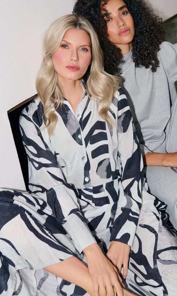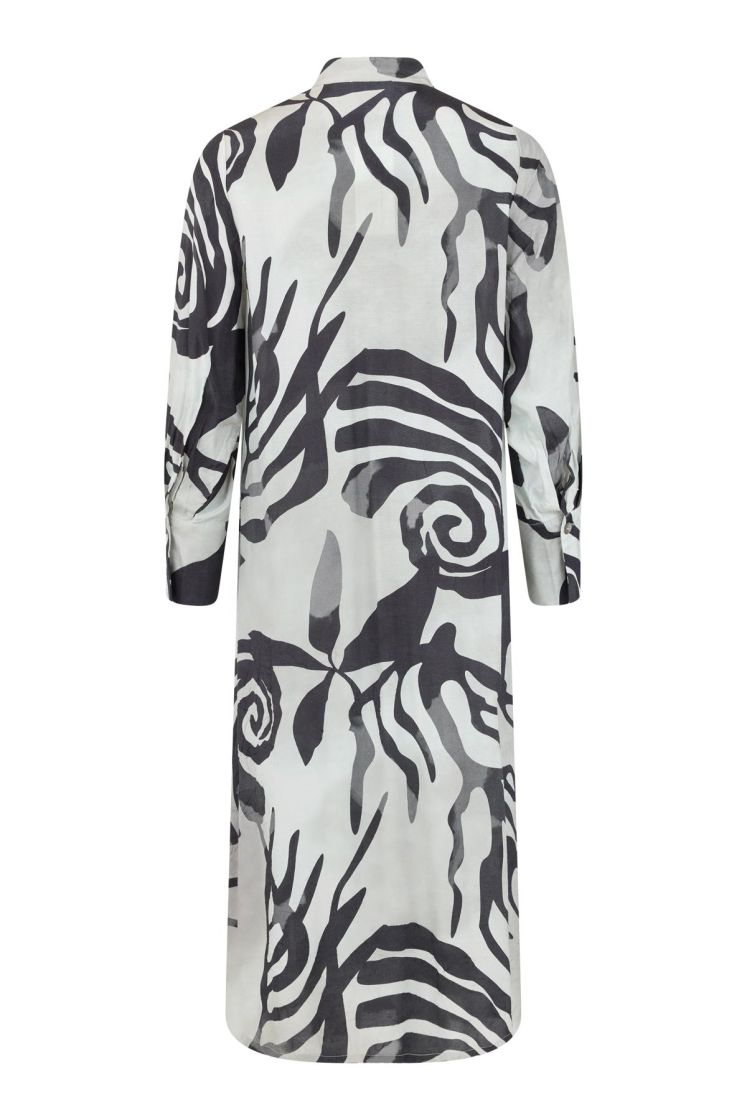 Pehmeästä viskoosista valmistettu NOEN mekko jossa on tyylikäs musta ja harmaa kuviointi.