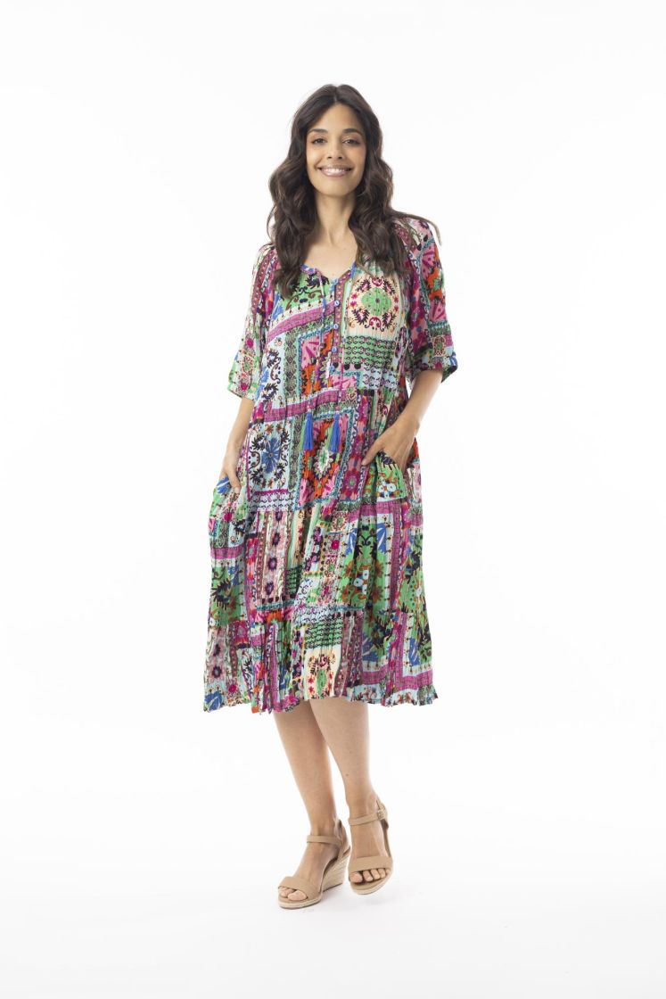 Sivuissa mekossa on taskut.
