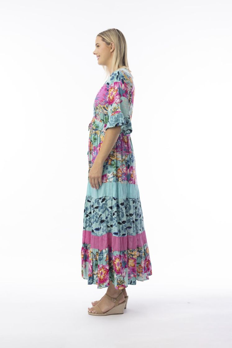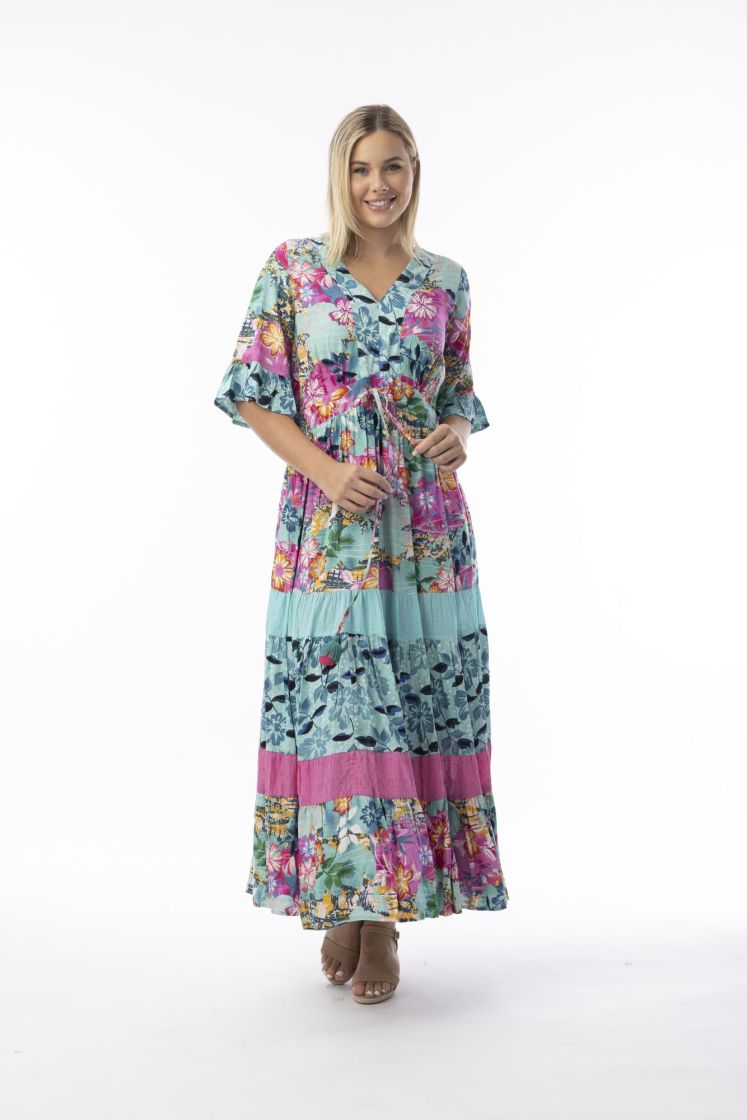Tämän mekon kankaissa yhdistyvät ihanan väriset kuosit sekä tekstuurit.