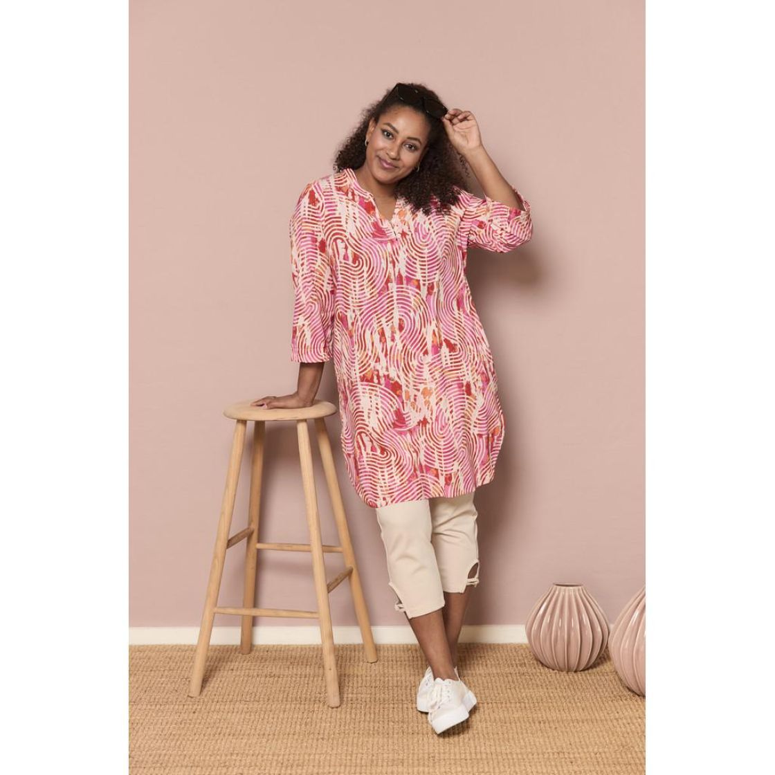 Naisellinen ja kevyt tunika, jossa on kaunis, värikäs kuvio, joka luo raikkaan ja kesäisen ilmeen. Pehmeä ja joustava kangas tuntuu mukavalta ihoa vasten ja laskeutuu kevyesti ja dynaamisesti vartalon ympärille.