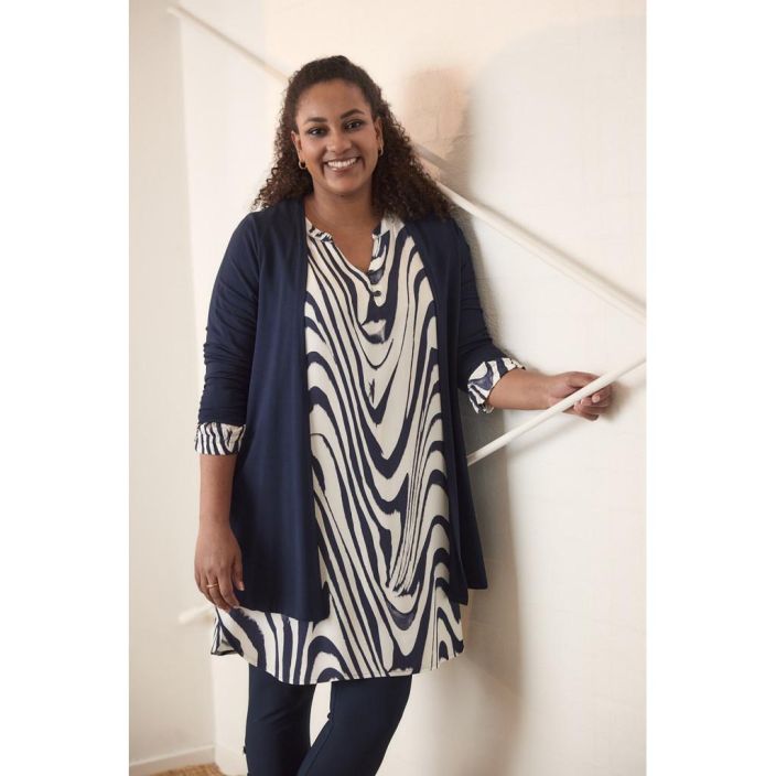 Elegantti ja kevyt tunika, jossa on kaunis graafinen kuvio, joka luo tyylikkään ja modernin ilmeen. Pehmeä viskoosikangas tuntuu mukavalta ihoa vasten ja laskeutuu kevyesti vartalon ympärille.
