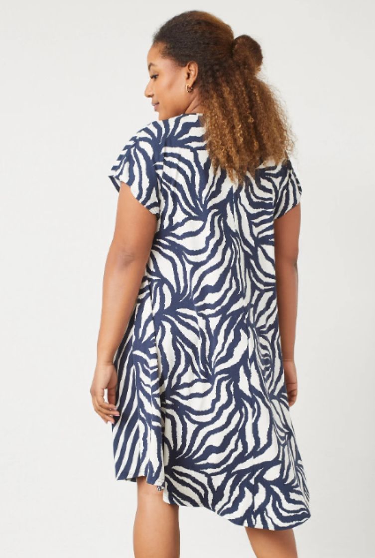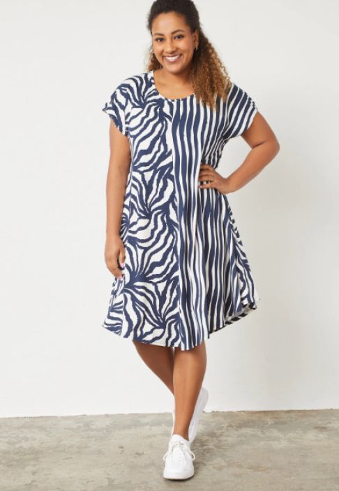 Kevyt ja elegantti mekko, jossa on moderni raitakuvio ja imarteleva A-leikkaus. Pehmeä ja joustava kangas takaa mukavan istuvuuden ja antaa mekolle kauniin laskeutumisen. Lyhyet hihat ja pyöreä pääntie korostavat klassista ilmettä, kun taas dynaamiset raidat lisäävät modernia ilmettä.
