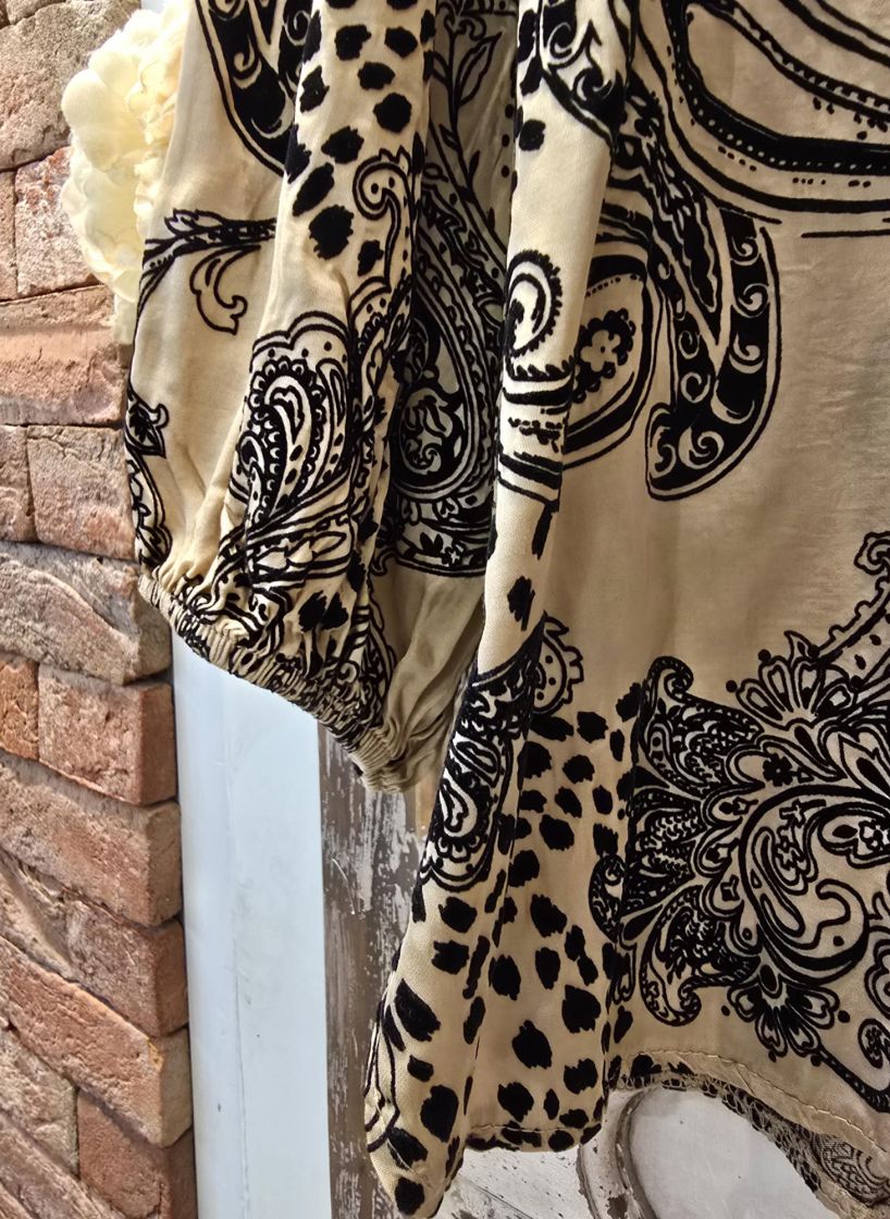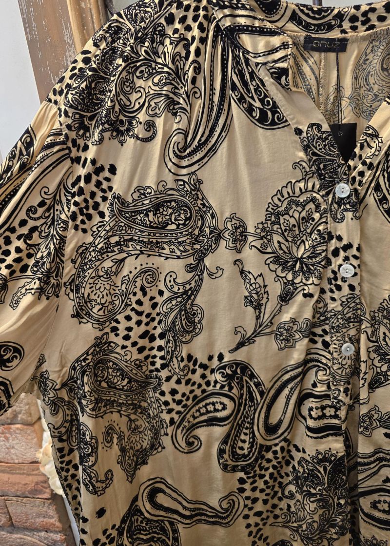 Tämä paita QNUZ mallistosta on todella pehmeä ja ajattoman tyylikäs. Kangas on pohjaltaan pehmeää viskoosi satiinia ja siihen on päälle ommeltu kaunis musta sametti kuosi.