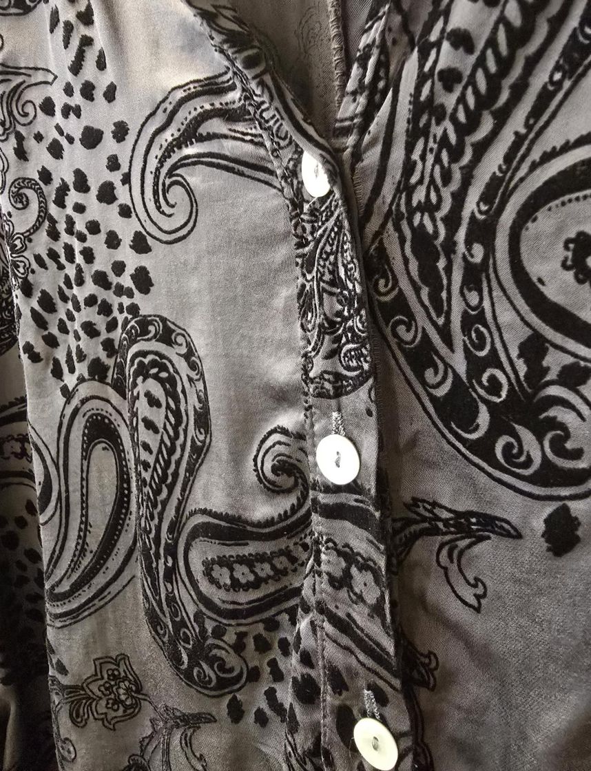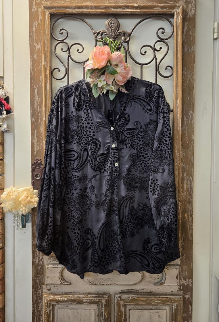 Tämä paita QNUZ mallistosta on todella pehmeä ja ajattoman tyylikäs. Kangas on pohjaltaan pehmeää viskoosi satiinia ja siihen on päälle ommeltu kaunis musta sametti kuosi.